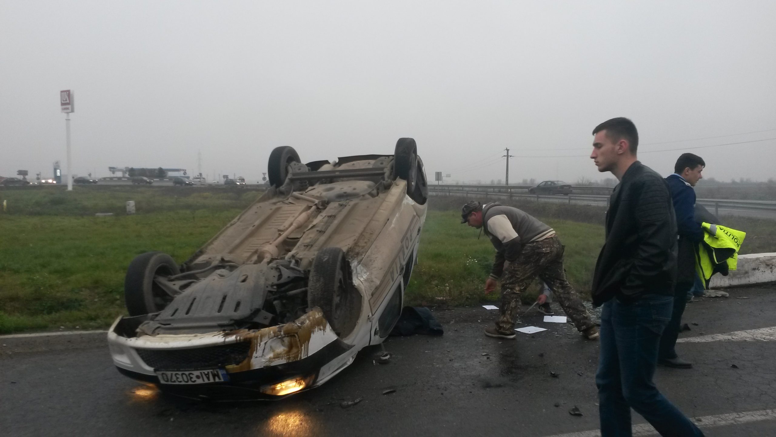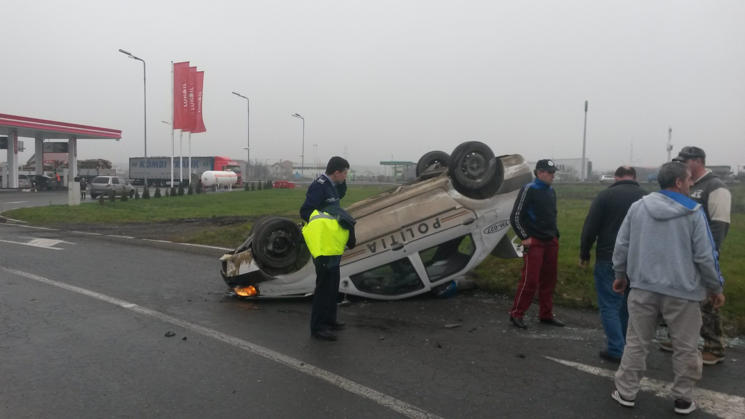 FOTO / Mașină de poliție răsturnată, lângă Timișoara
