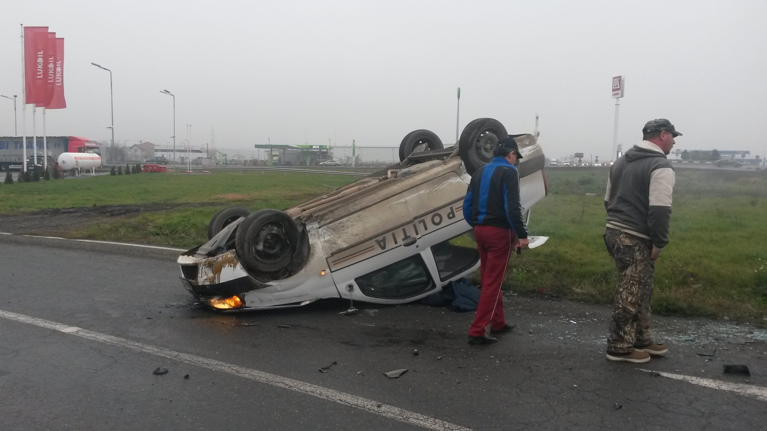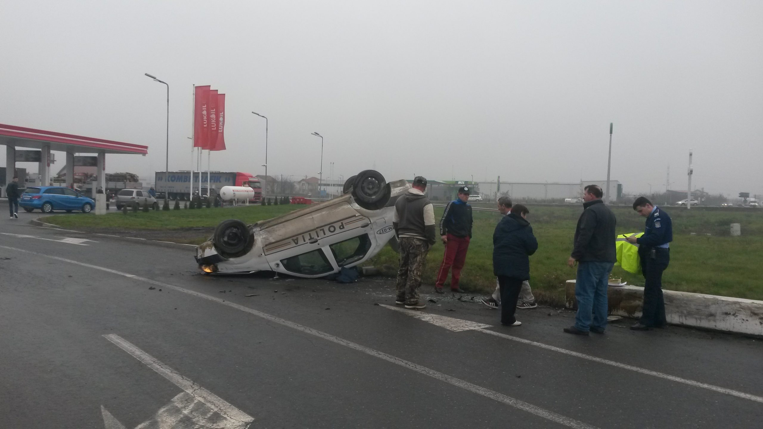 Un autoturism al Inspectoratului Județean Timiș s-a răsturnat în această după-amiază, lângă Timișoara. Accidentul s-a petrecut la ieșirea din Dumbrăvița spre Giarmata, lângă stația Lukoil. Conducătorul auto a derapat, iar mașina s-a lovit de un cap de pod. Șoferul, un polițist aflat în timpul programului, nu a fost rănit. Incidentul a fost semnalat imediat la numărul de urgență 112.