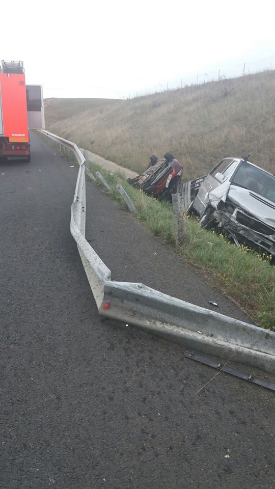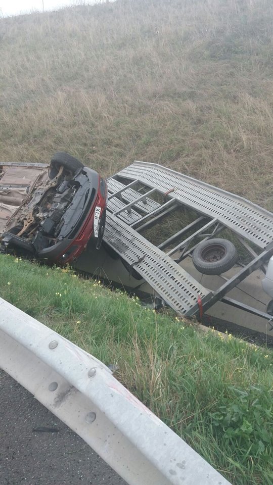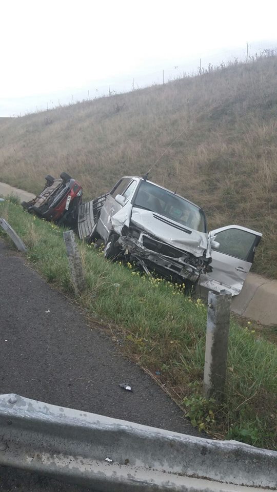 Pompierii de la Inspectoratul pentru Situații de Urgență Timiș au fost chemați să intervină la un accident produs pe autostrada A1. O dubă cu platformă, pe care se afla o mașină, s-a răsturnat în afara părții carosabile. Forțele de intervenție au găait la fața locului doi bărbați răniți, în vârstă de 25, respectiv de 75 de ani.