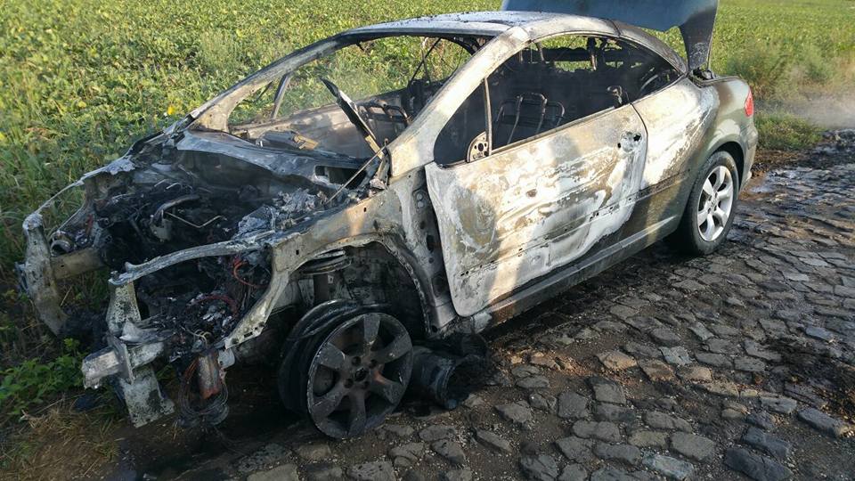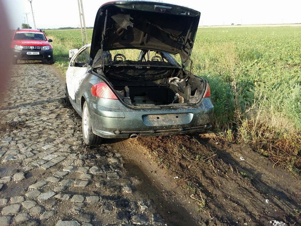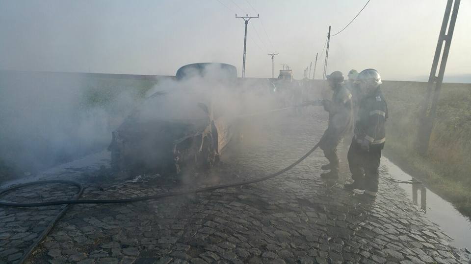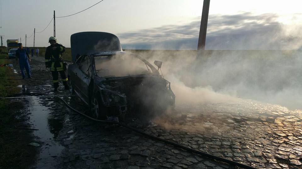O mașină s-a făcut scrum, astăzi, după ce s-a aprins în mers pe șoseaua dintre Satchinez și Biled.