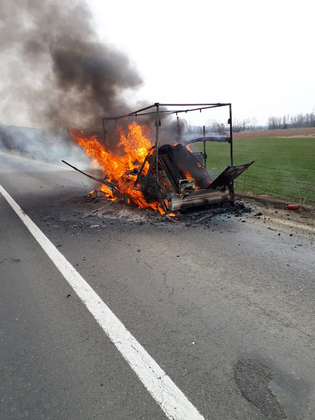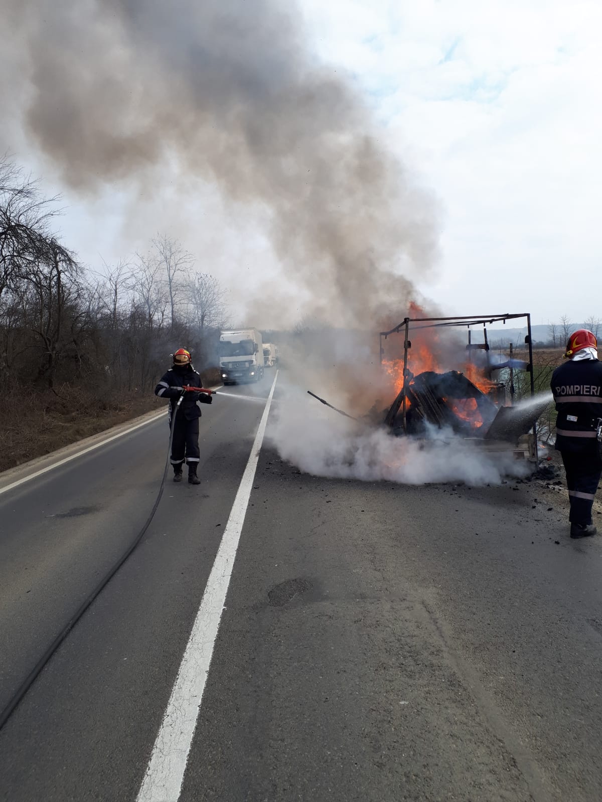 O remorcă încărcată cu bagaje a luat foc în mers în zona localității comunei Vărădia de Mureș, din județul Arad.