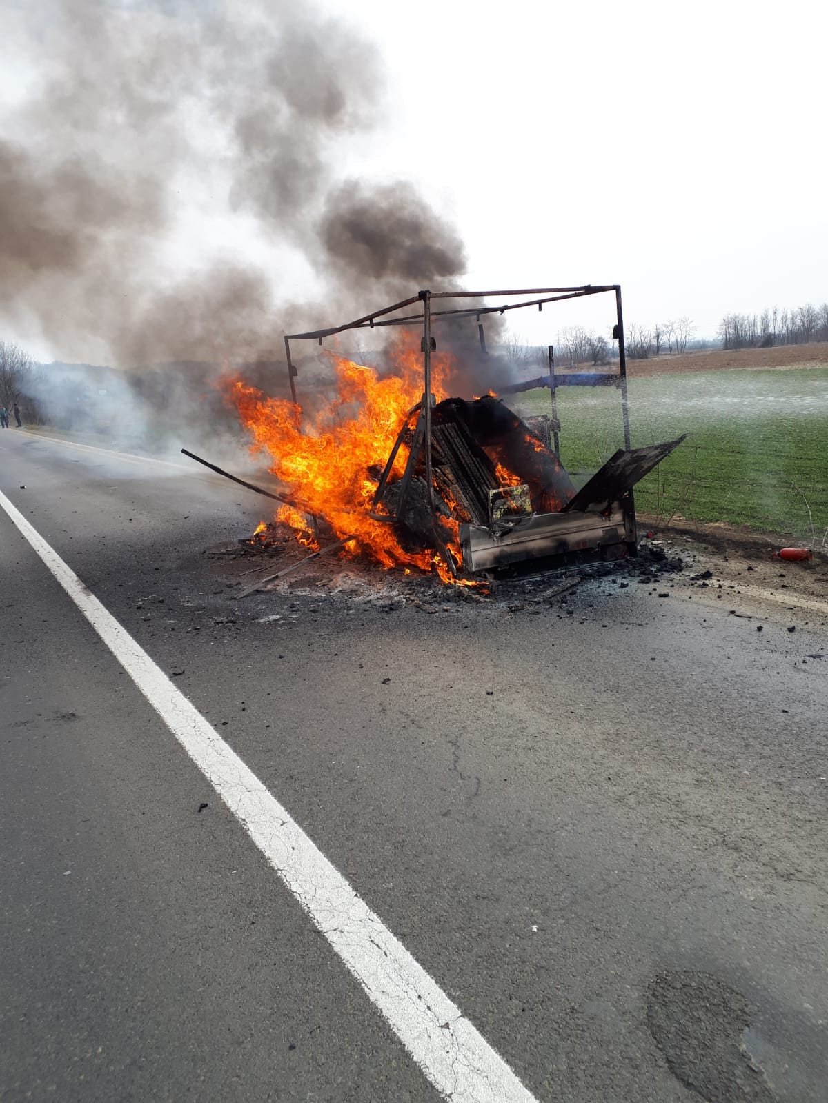 FOTO/ O remorcă a luat foc în mers pe DN 7, în Arad