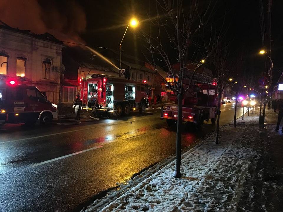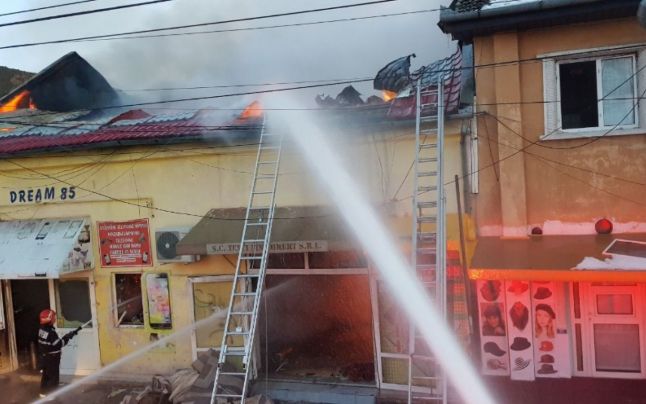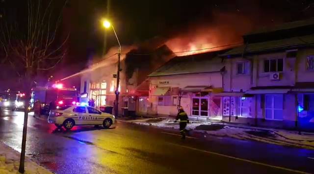 Cel puțin două imobile, în care se află spații comerciale, au fost cuprinse de flăcările care s-au extins de la un acoperiș, spun pompierii. Circulaţia în zonă a fost blocată, pentru a permite acţiunea nestingherită a pompierilor.