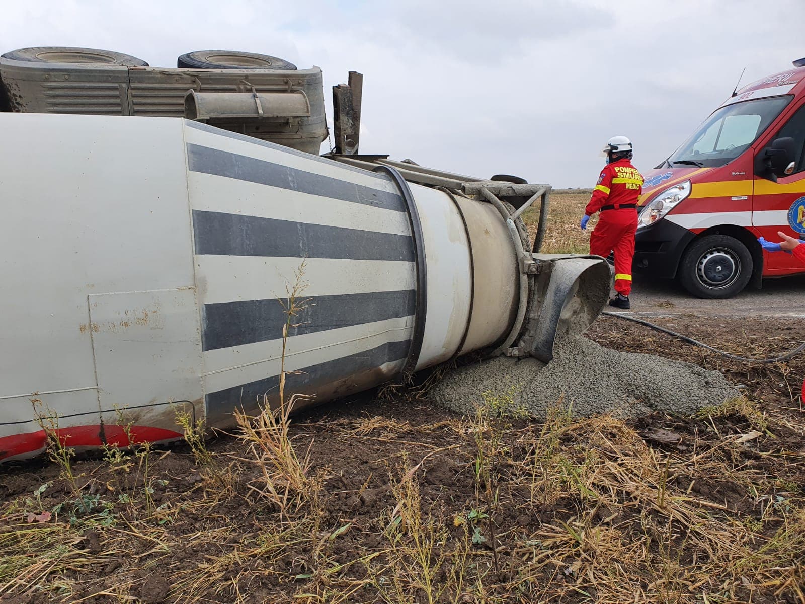 Accidentul s-a produs înainte de prânz în localitatea Peciu Nou, unde o autobetonieră s-a răsturnat în afara părții carosabile.