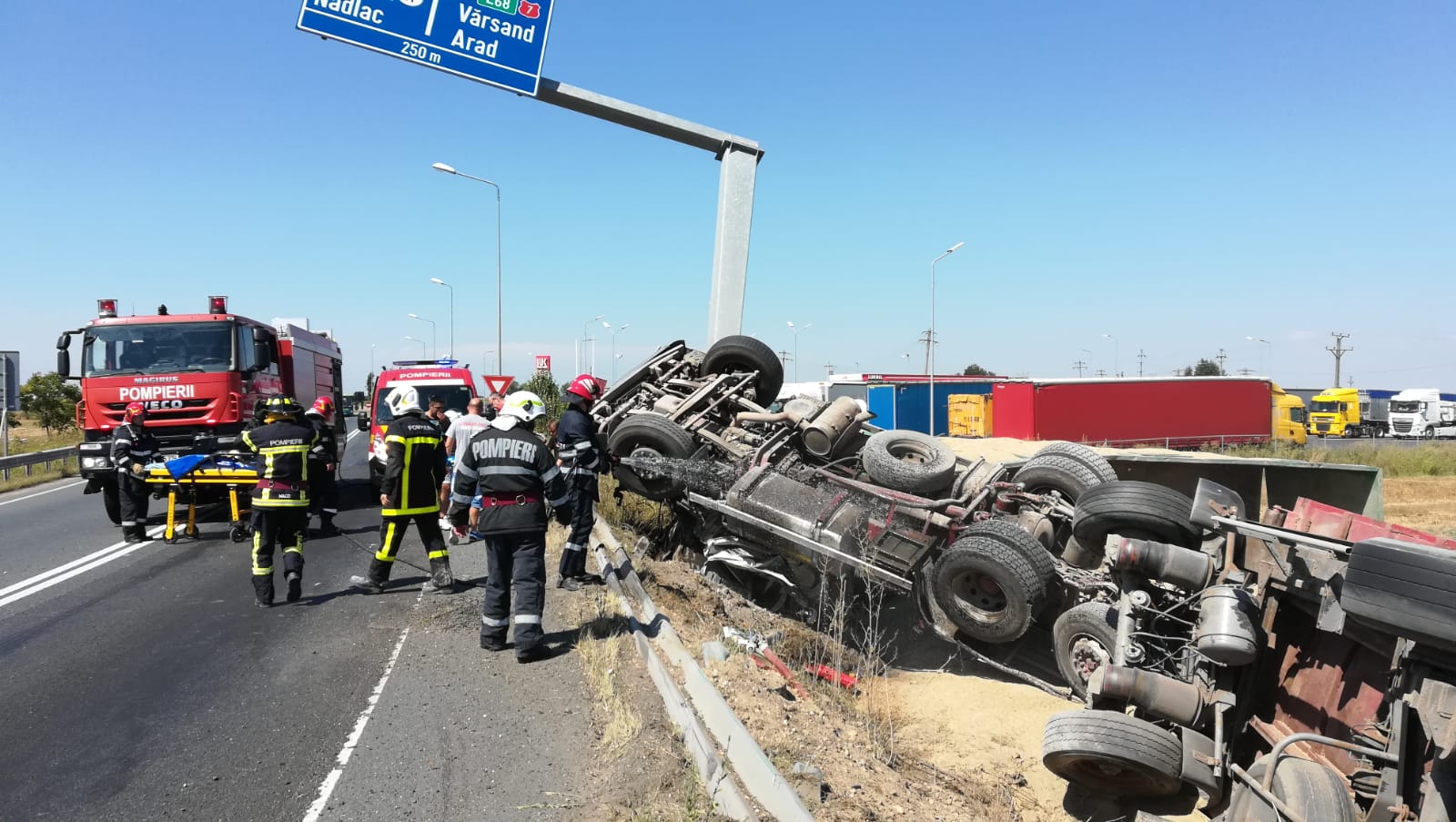 Câteva minute mai târziu, un TIR încărcat cu cereale s-a răsturnat pe breteaua de legatură dintre autostrada A1 și DN7, coborâre spre zona industrială Arad. În urma accidentului, șoferul autocamionului a fost transportat la spital.