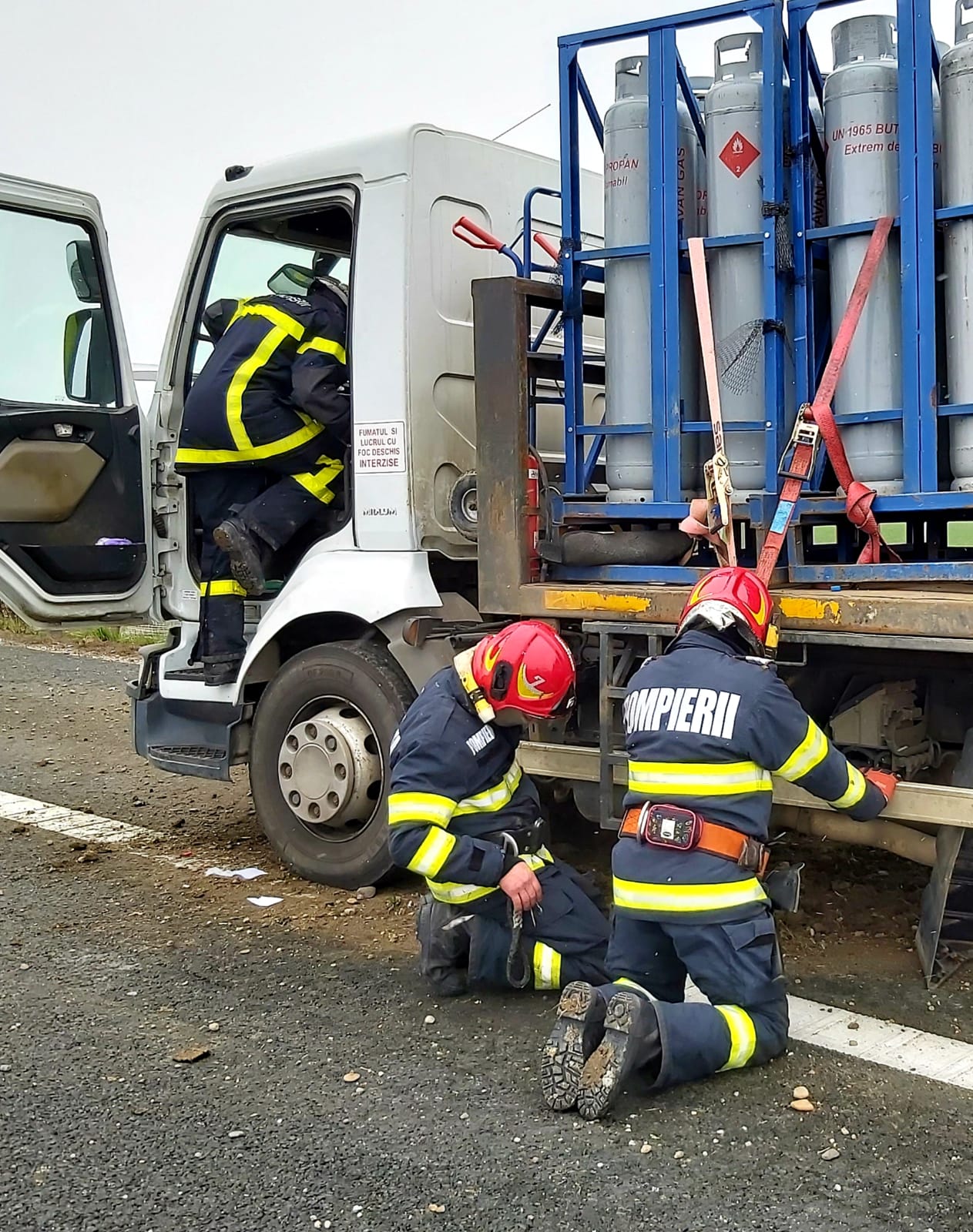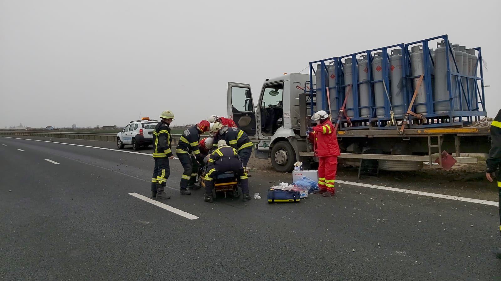Un camion încărcat cu 140 de butelii cu propan a fost implicat într-un incident rutier pe autostrada A1, în judeţul Arad. Vehiculul s-a lovit de parapetul de protecţie după ce şoferului i s-ar fi făcut rău. Şoferul a fost găsit inconştient de către echipele de salvare ale ISU Arad şi i s-au aplicat manevre de resuscitare.