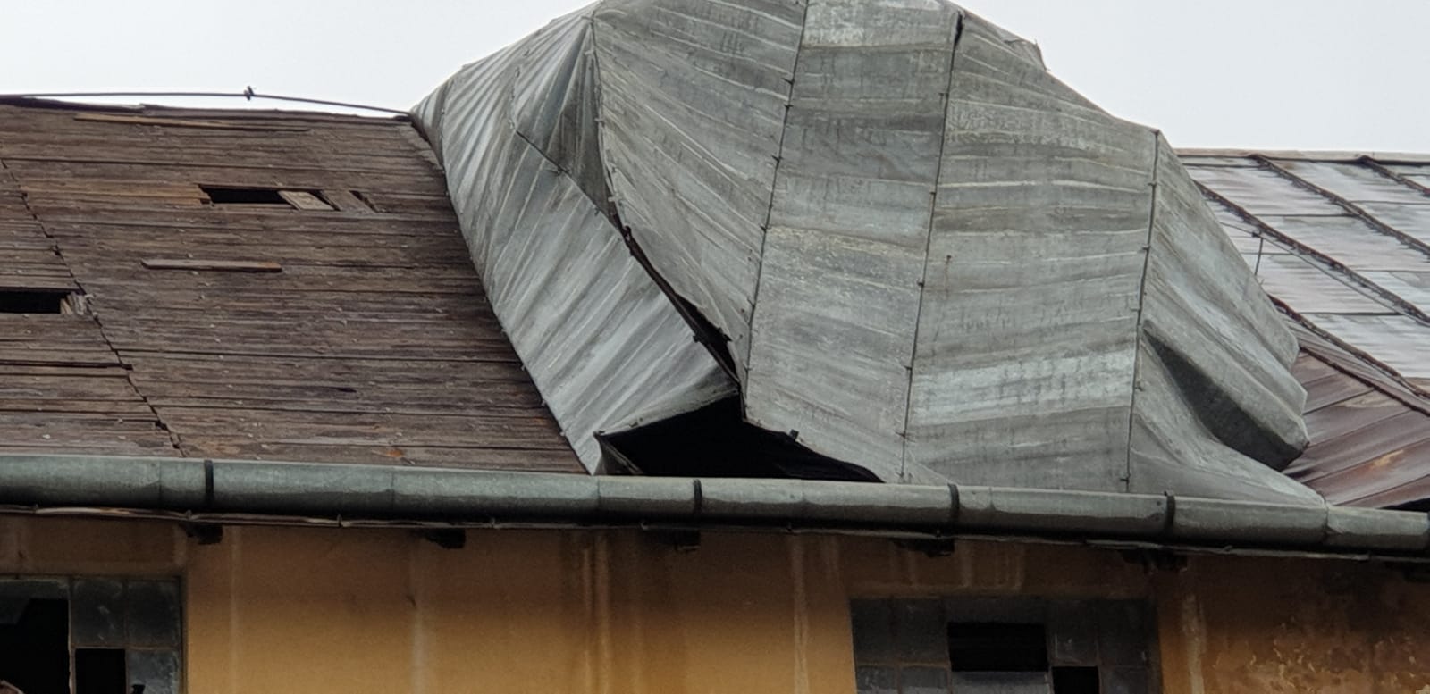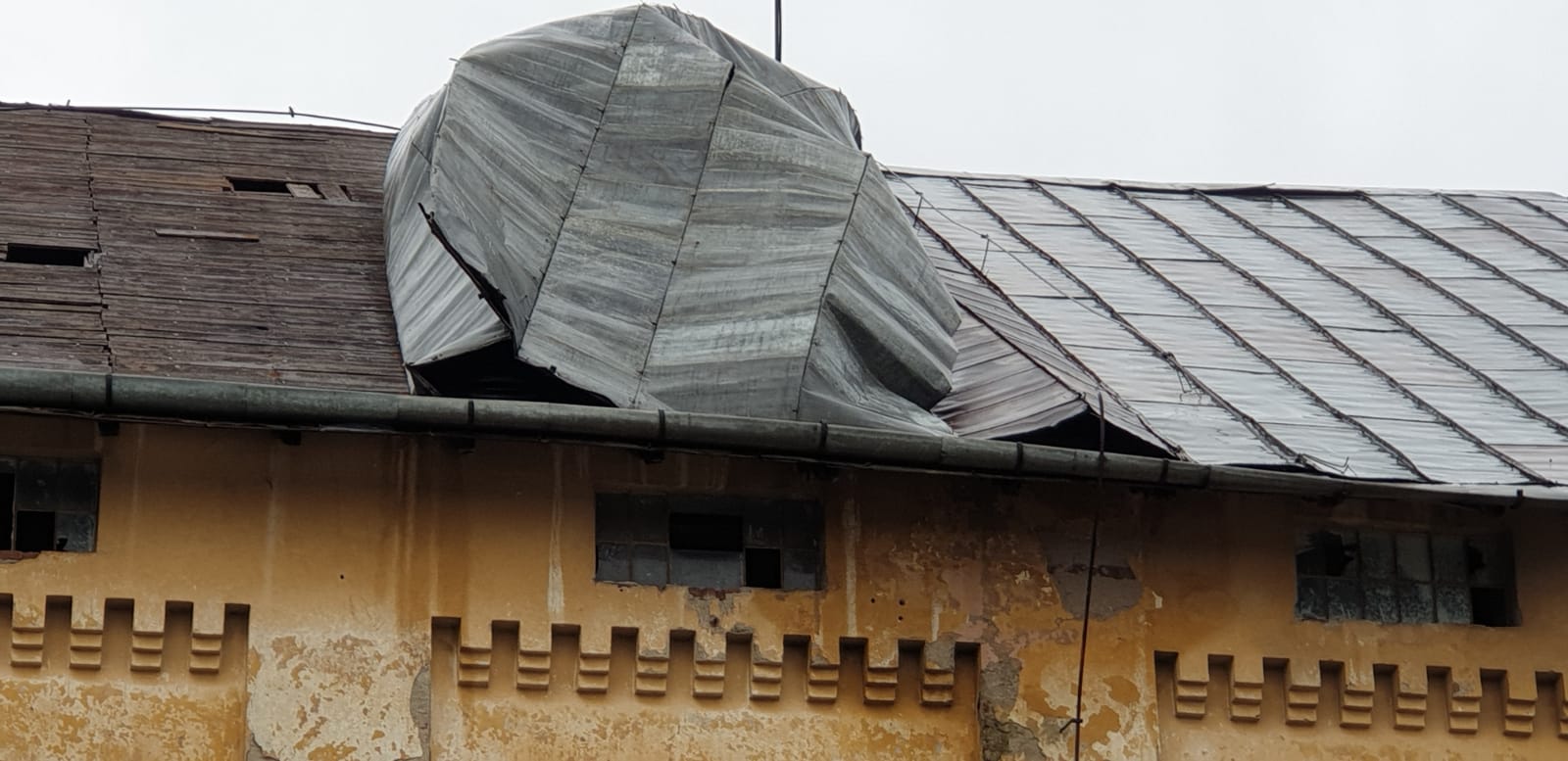 Oamenii care locuiesc în zonă sunt speriați, pentru că bucățile din tablă grea de câteva zeci de kilograme riscă să se prăbușească pe caldarâm.