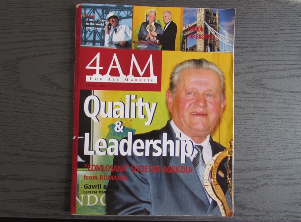 Cele trei pagini din interiorul revistei 4AM-for all markets dedicate societății agricole Comloșana din Comloșu Mare și managerului general Gavril Balog.