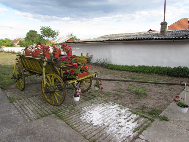 La societățile agricole moderne, așa cum este și Comloșana din Comloșu Mare, vechile căruțe mai sunt doar un excelent și atractiv suport de flori.