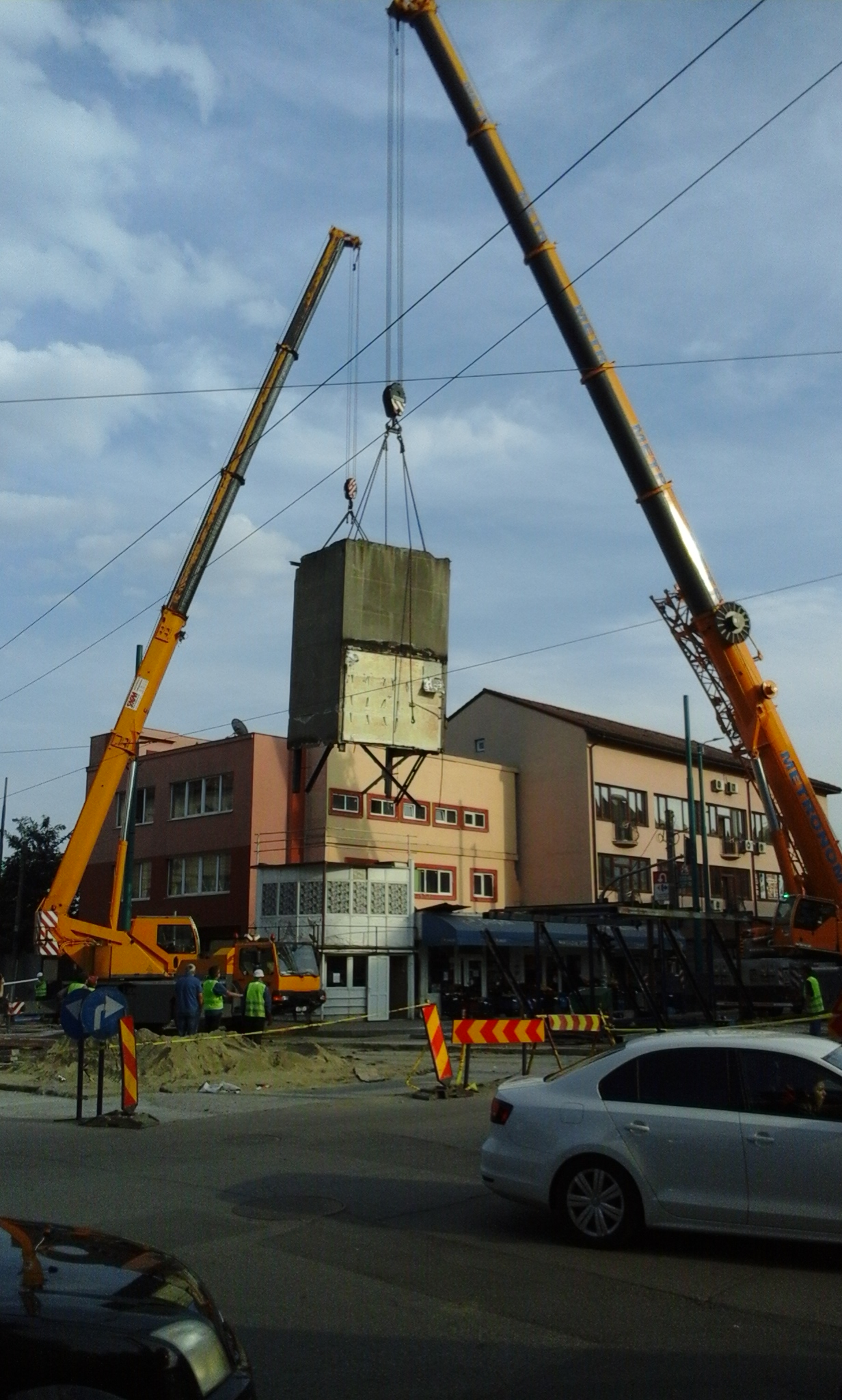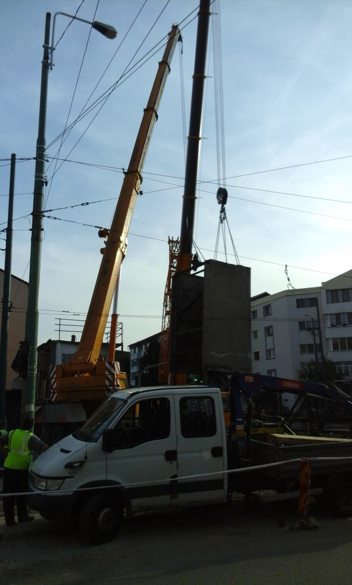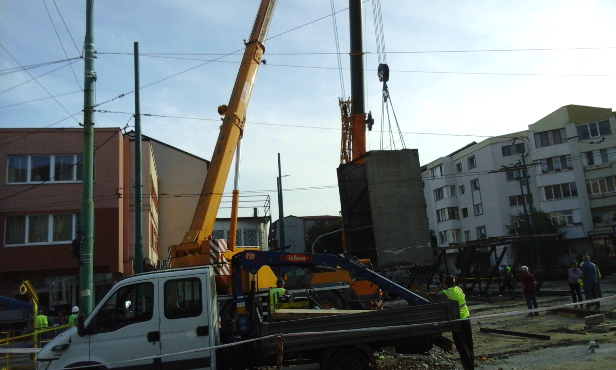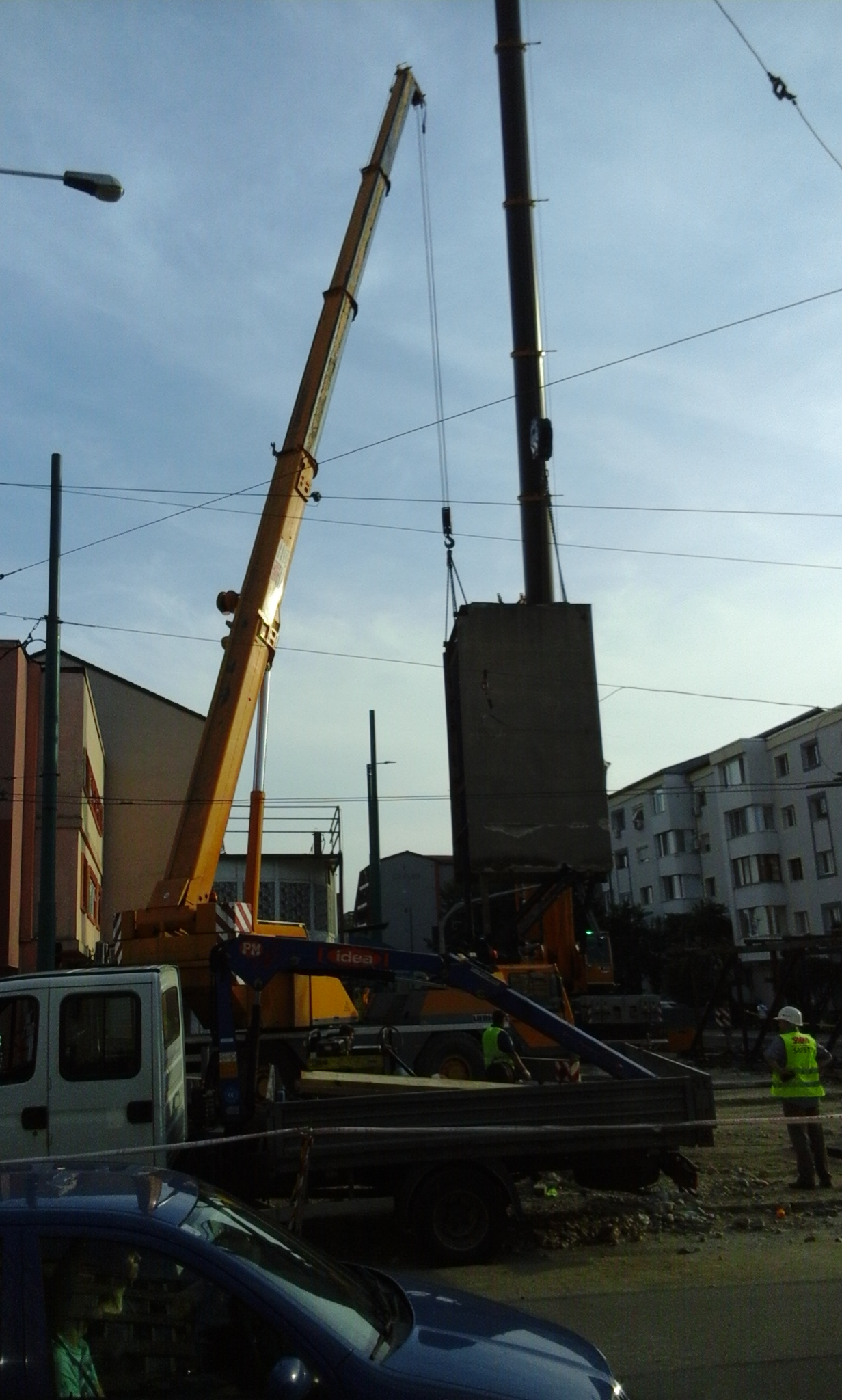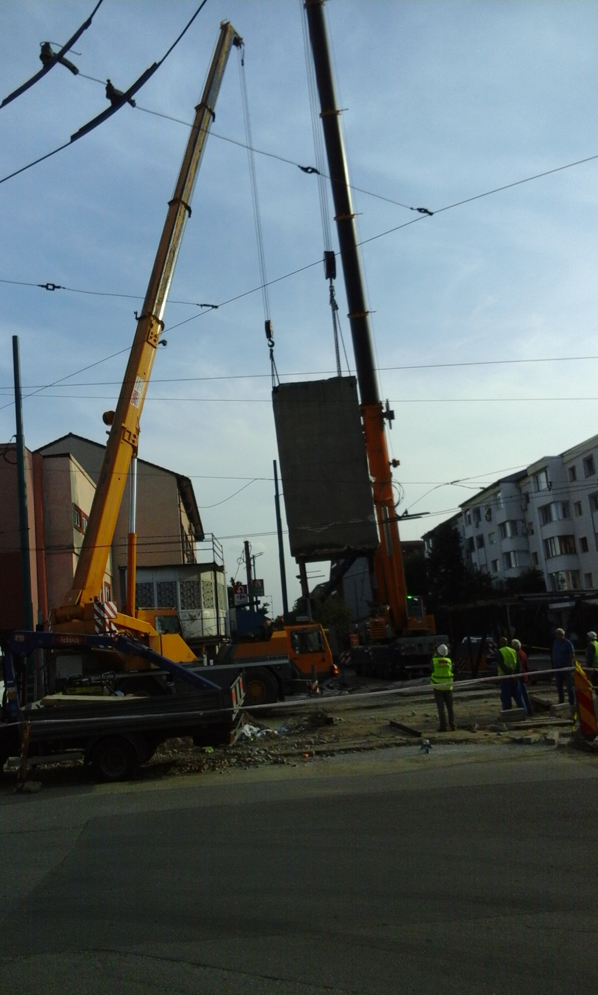 Operațiunea a început cu dislocarea părții transversale, pentru care au fost folosite două macarale. Aseară au fost demolați și pilonii verticali, astfel că acum urmează lucrările de amenajare a intersecției.