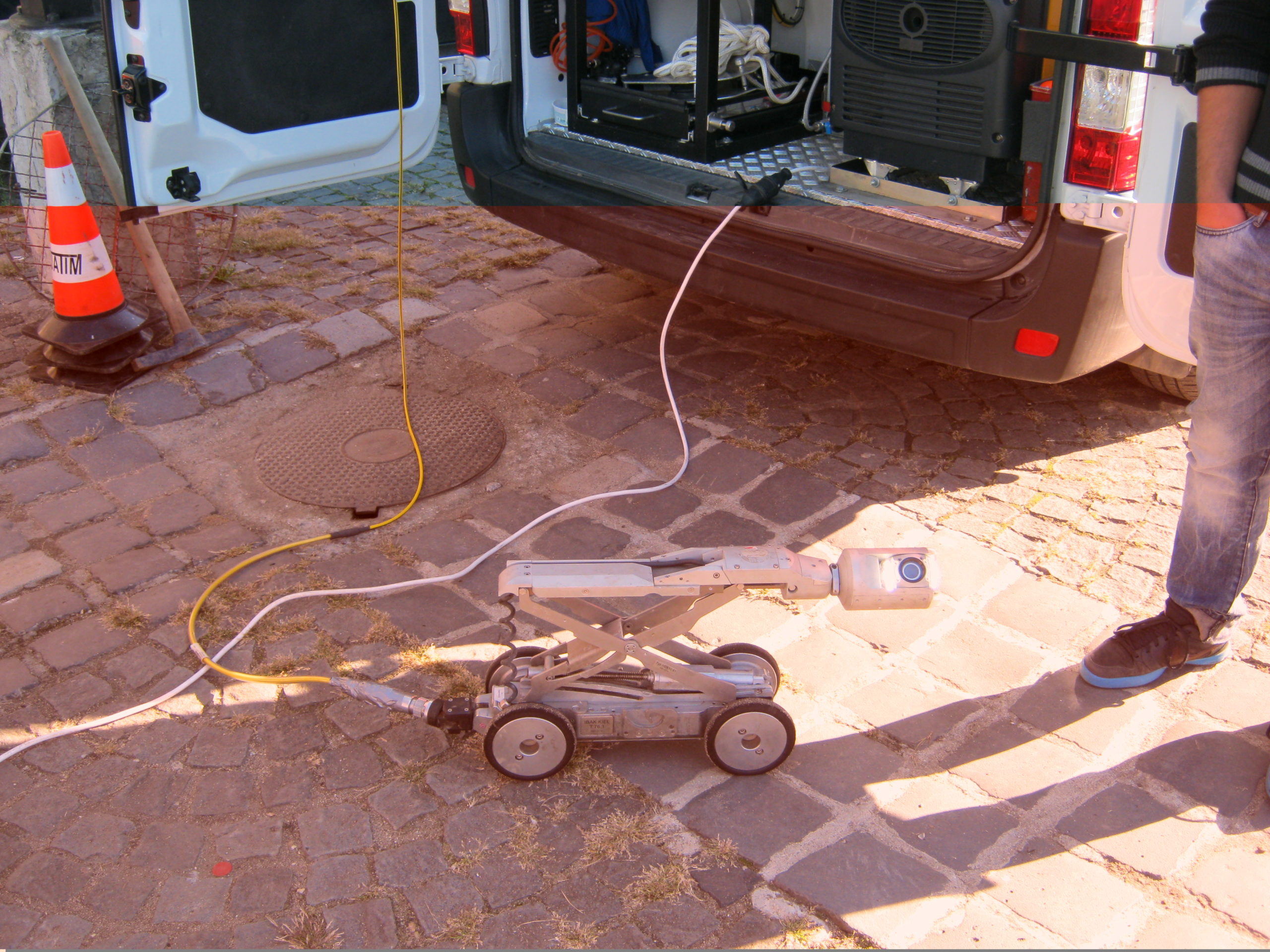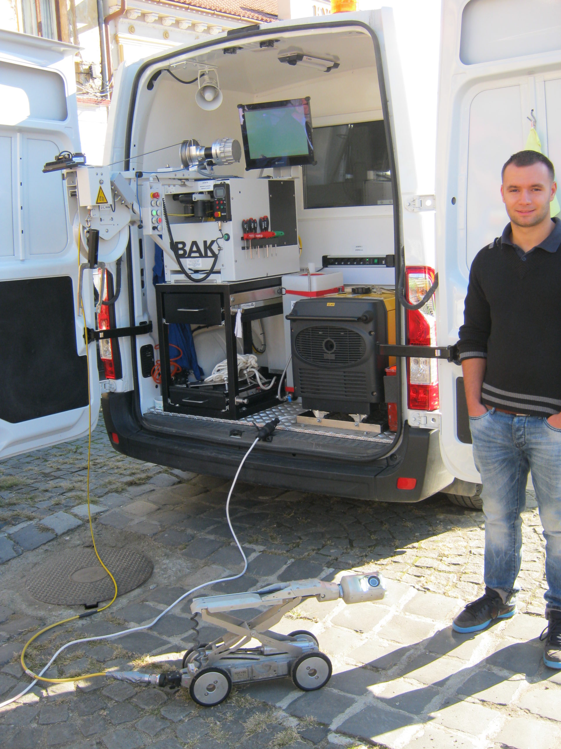 Principiul este simplu: există o cameră foarte performantă care este montată pe un cărucior; caruciorul se deplasează prin canal și avem posibilitatea să filăm lateral, să filmăm la 360 de grade întreaga canalizare, să inspectăm racordurile, în cazul în care avem de făcut recepții la lucrări noi putem vedea dacă constructorul a executat conform proiectului inclusiv racordările la rețeaua principală.