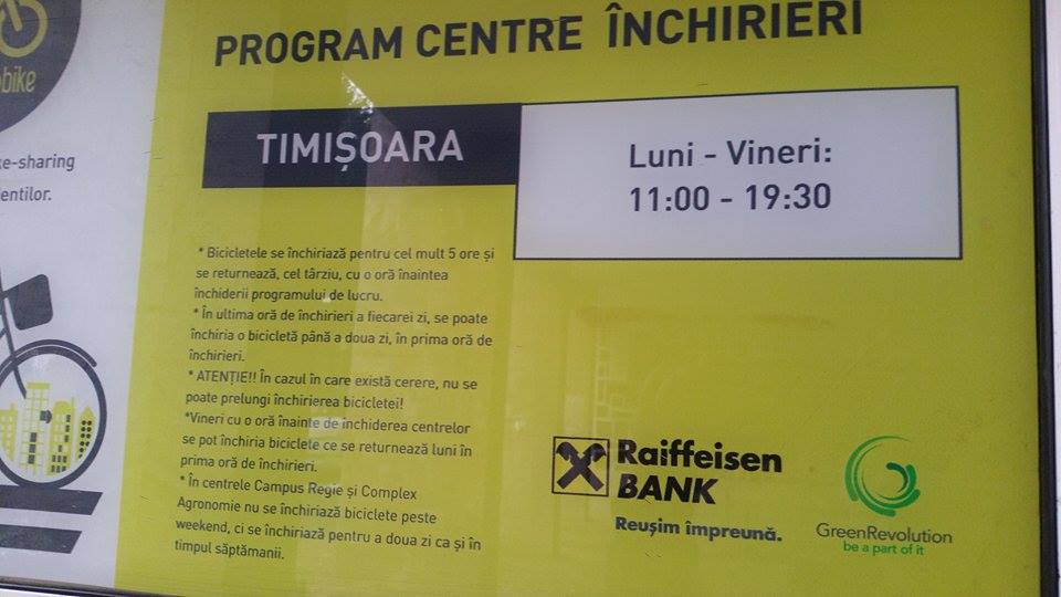 Iar dacă vremea se încumetă să se îndrepte, bicicletele vor fi în rastele până la sfârşitul lunii noiembrie. Într-o primă etapă, bicicletele putea fi luate de la UVT, însă pentru că au fost multe cereri s-a m-ai deschis un punct la Universitatea de Științe Agricole, spune managerul de proiect GreenRevolution, Bogdan Ionete.