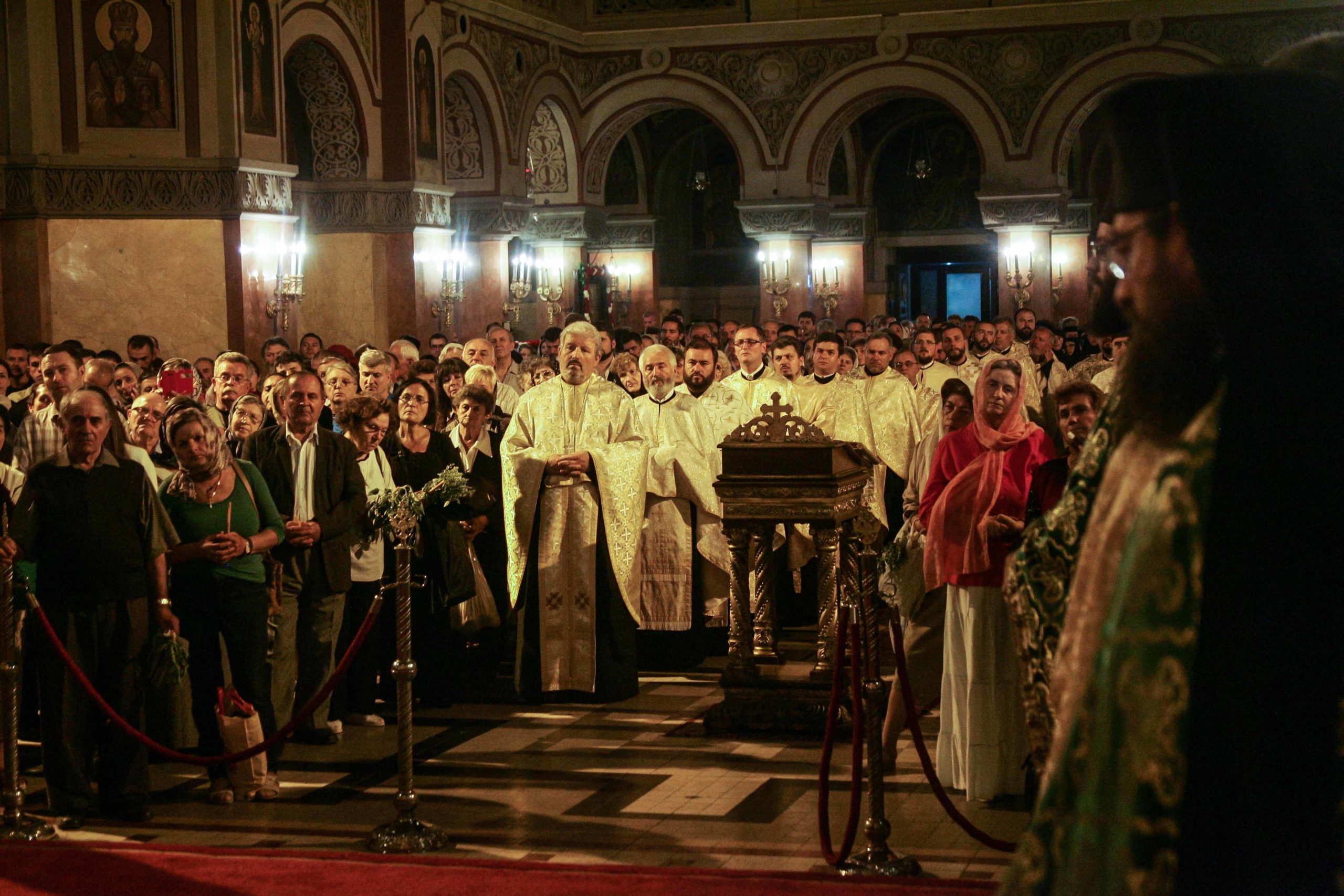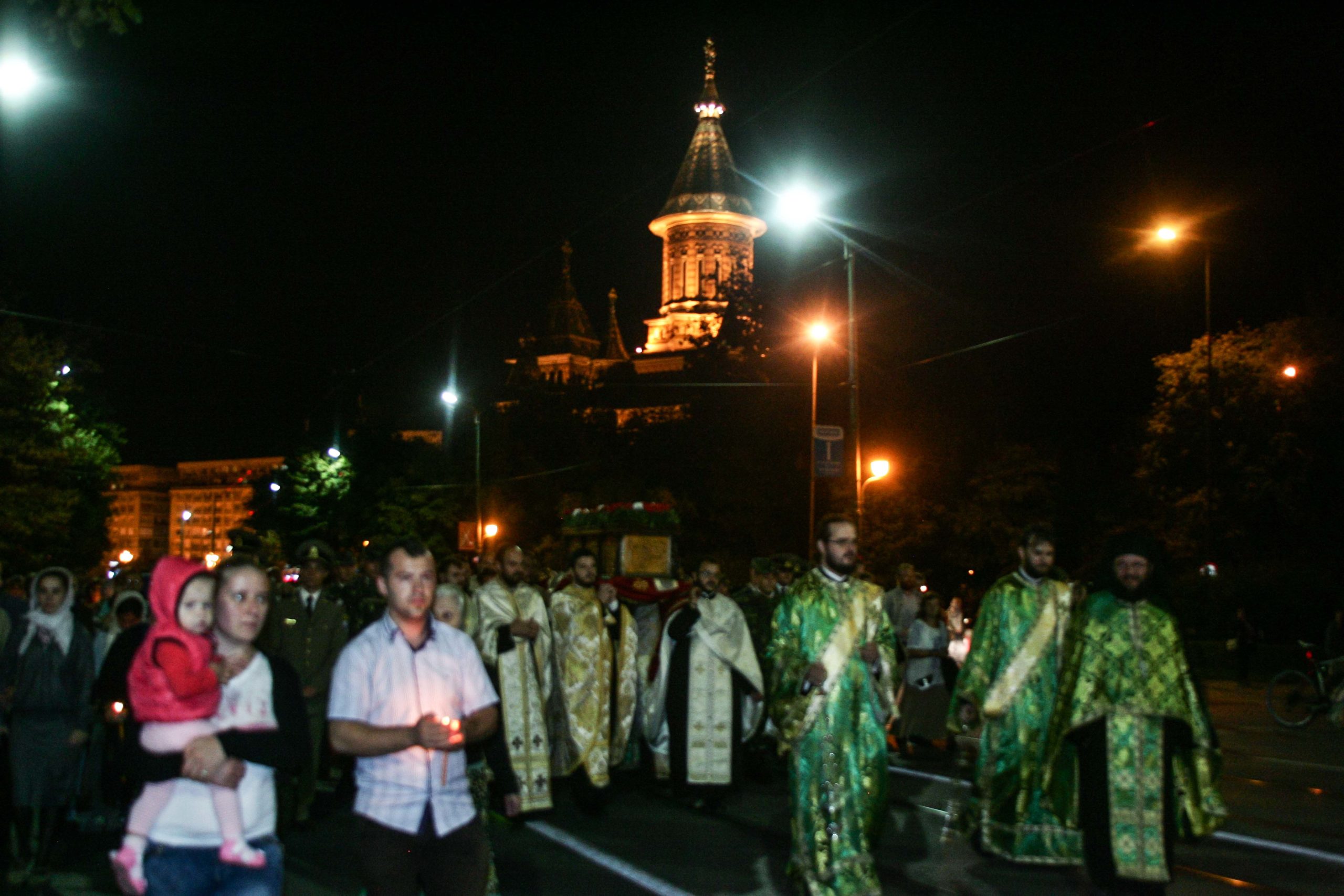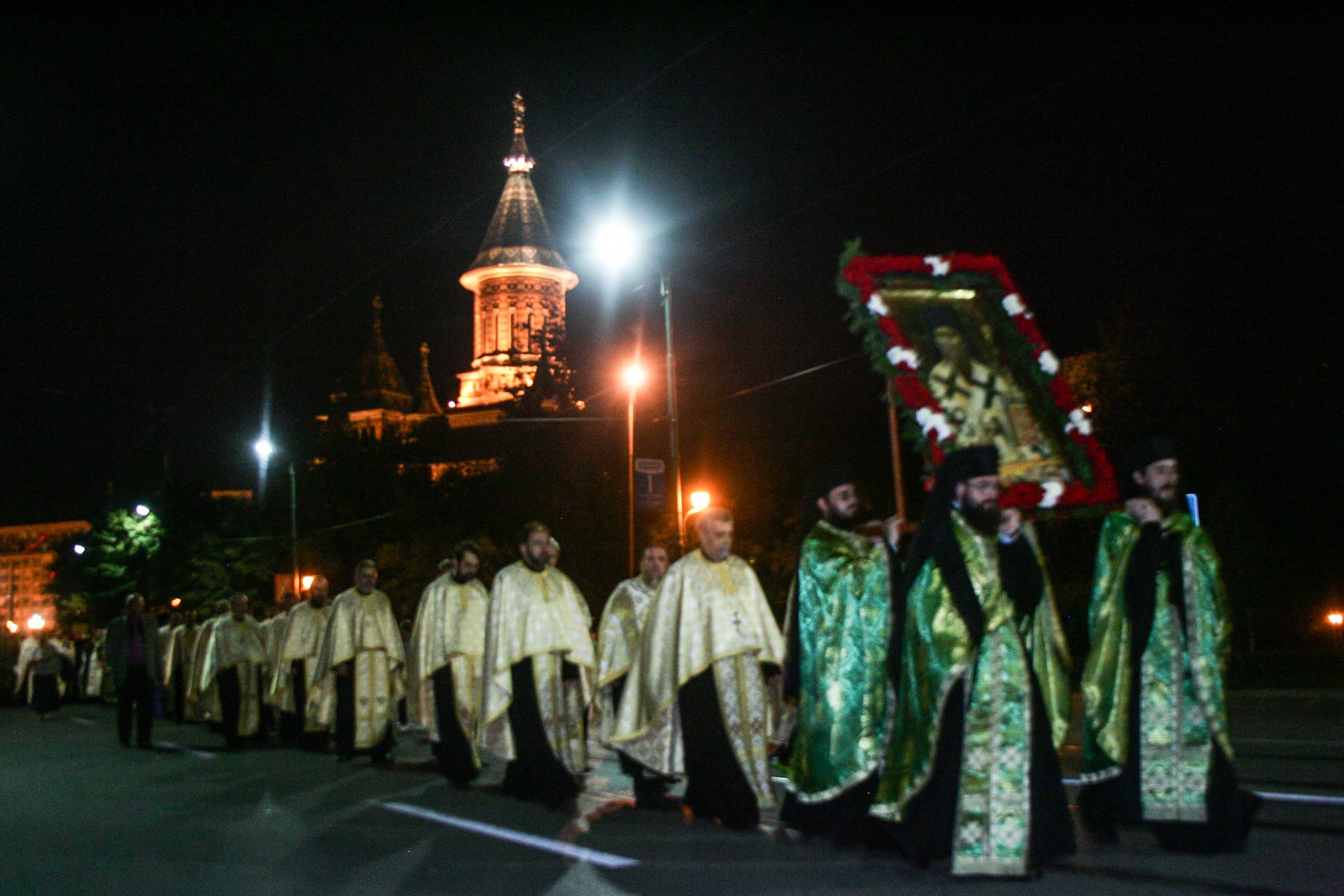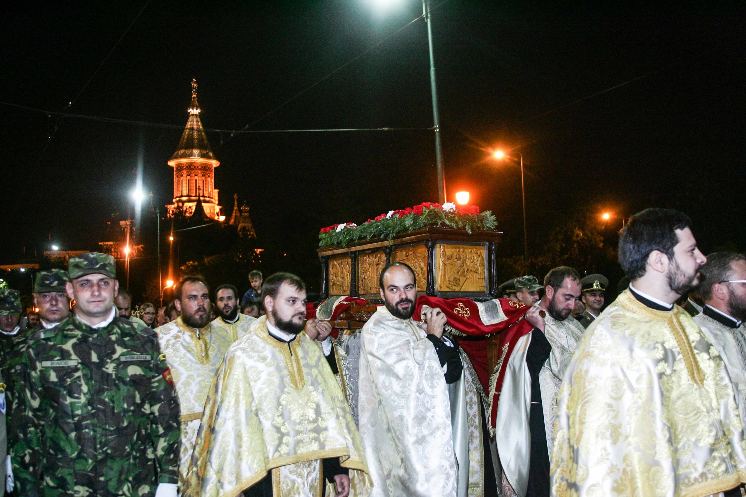 Catedrala Mitropolitană din Timişoara a devenit neîncăpătoare. Imediat după Vecernia cu Litie, mii de credincioși au ieșit din lăcașul de cult și au pornit în procesiune. Mitropolitul Banatului împreună cu un sobor de preoti, măicuţe, dar şi mii de credinciosi s-au închinat și au purtat moaștele Sfântului Ierarh Iosif cel Nou de la Partoş pe traseul stabilit de fețele bisericesti.