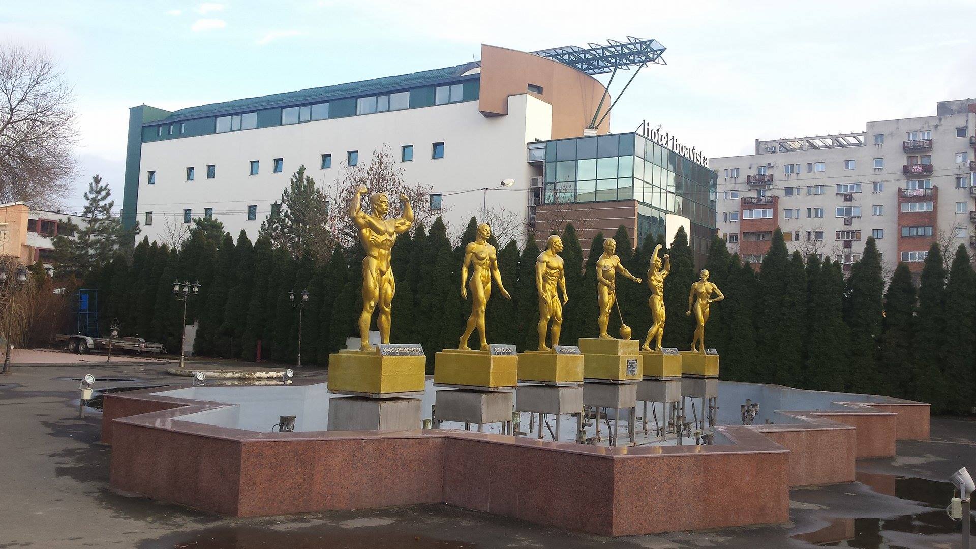 În urmă cu şase ani, Florin Teodorescu a realizat primul grup statuar într-una din fântânile din faţa Sălii Olimpia, cu şase personalităţi mondiale ale culturismului, printre care şi Arnold Schewarzneger. Acesta a încercat să rebrenduiască şi fântâna de pe cealaltă latură, însă nu a primit autorizaţie de la Primărie.