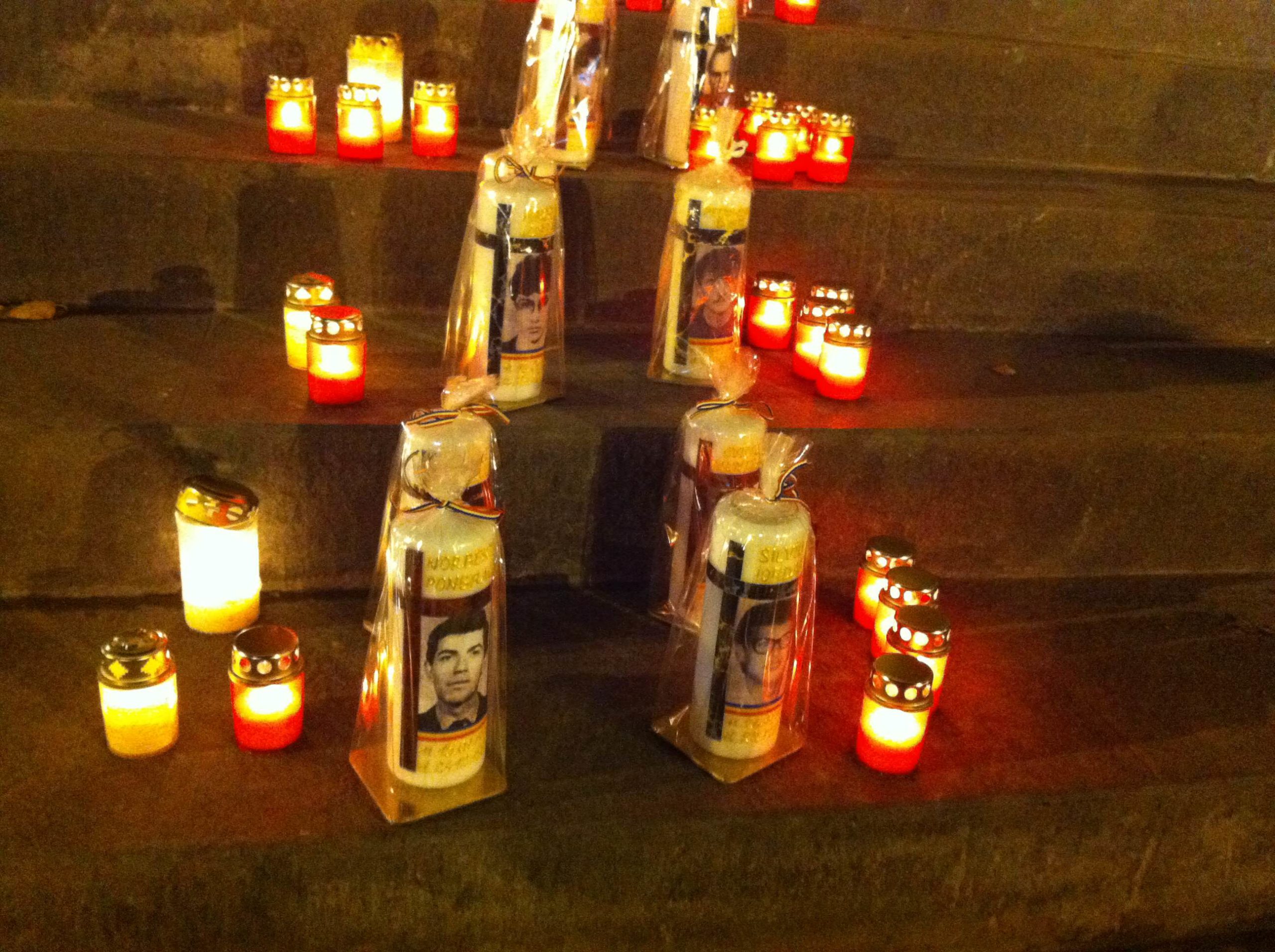 111 lumânari albe pe care sunt chipurile celor care și-au dat viata pentru libertate au fost așezate cu grija pe treptele Catedralei. Lânga ele, mici candele rosii au fost aprinse de rudele ramase in viata.