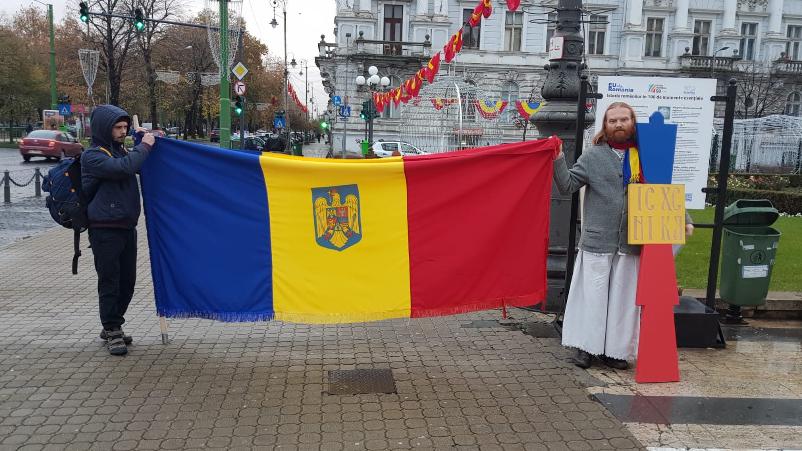 Pe parcursul traseului, cei doi arădeni flutur un drapel de mari dimensiuni, iar unul dintre ei a ales să îmbrace costumul popular.