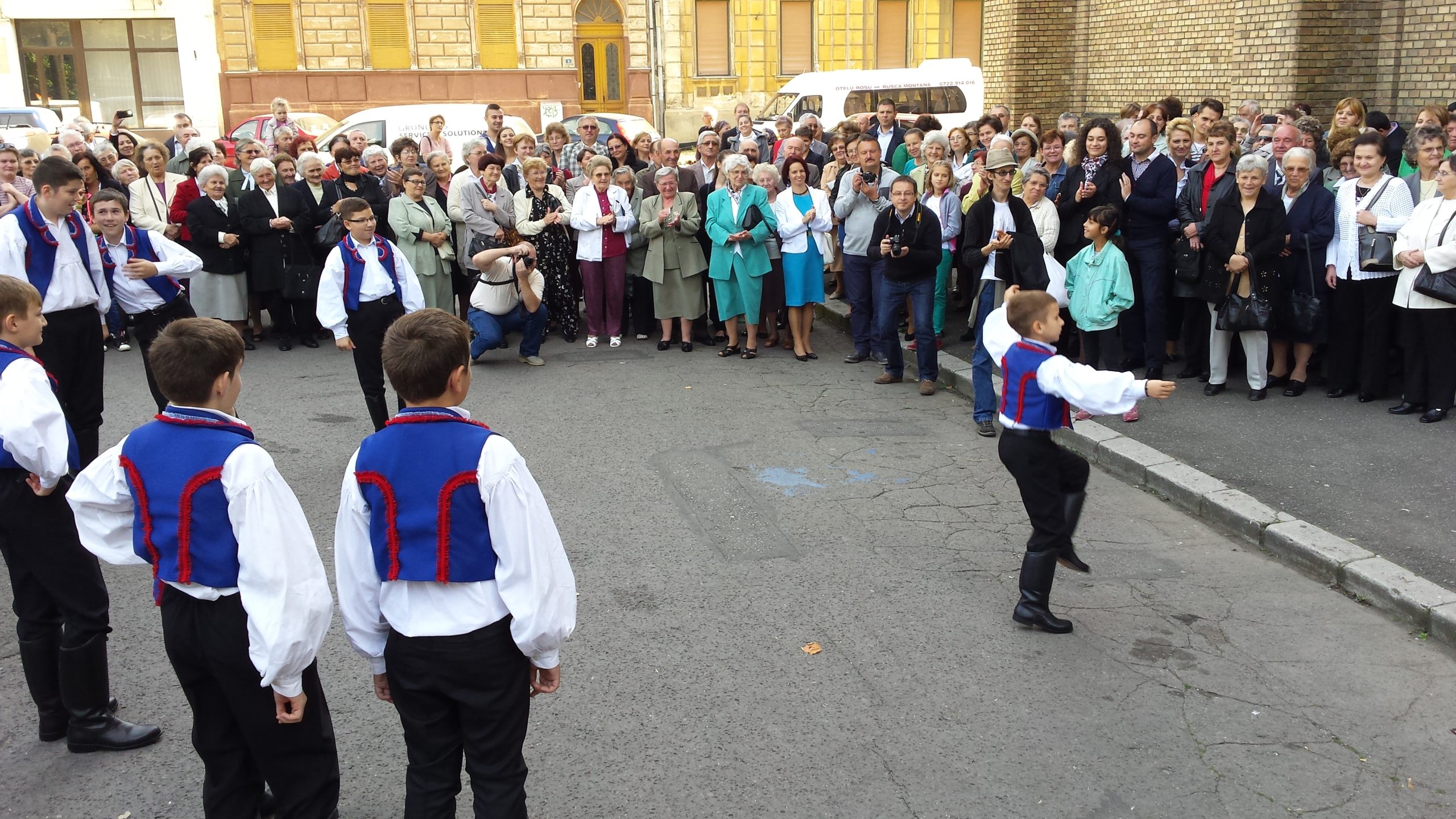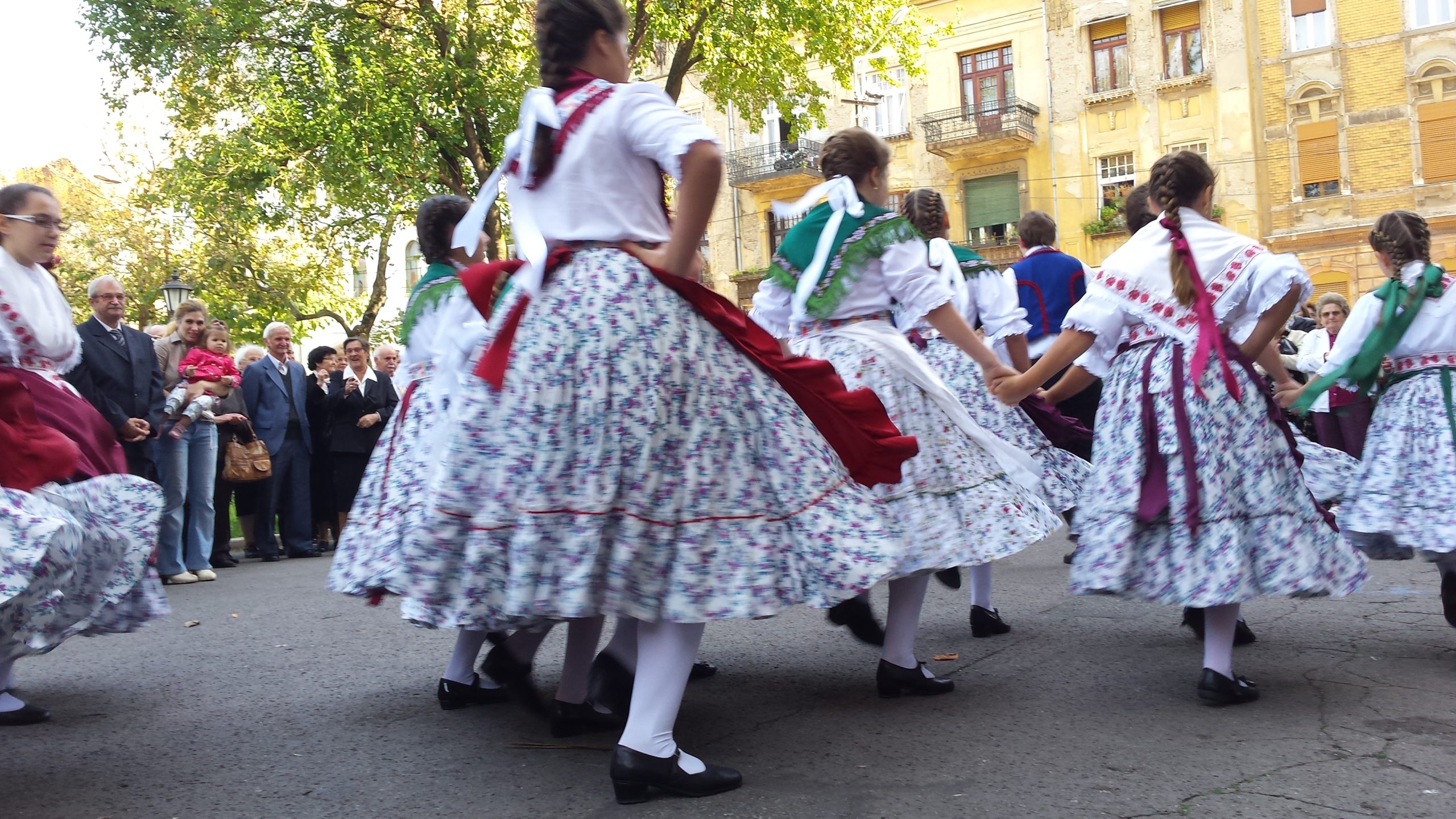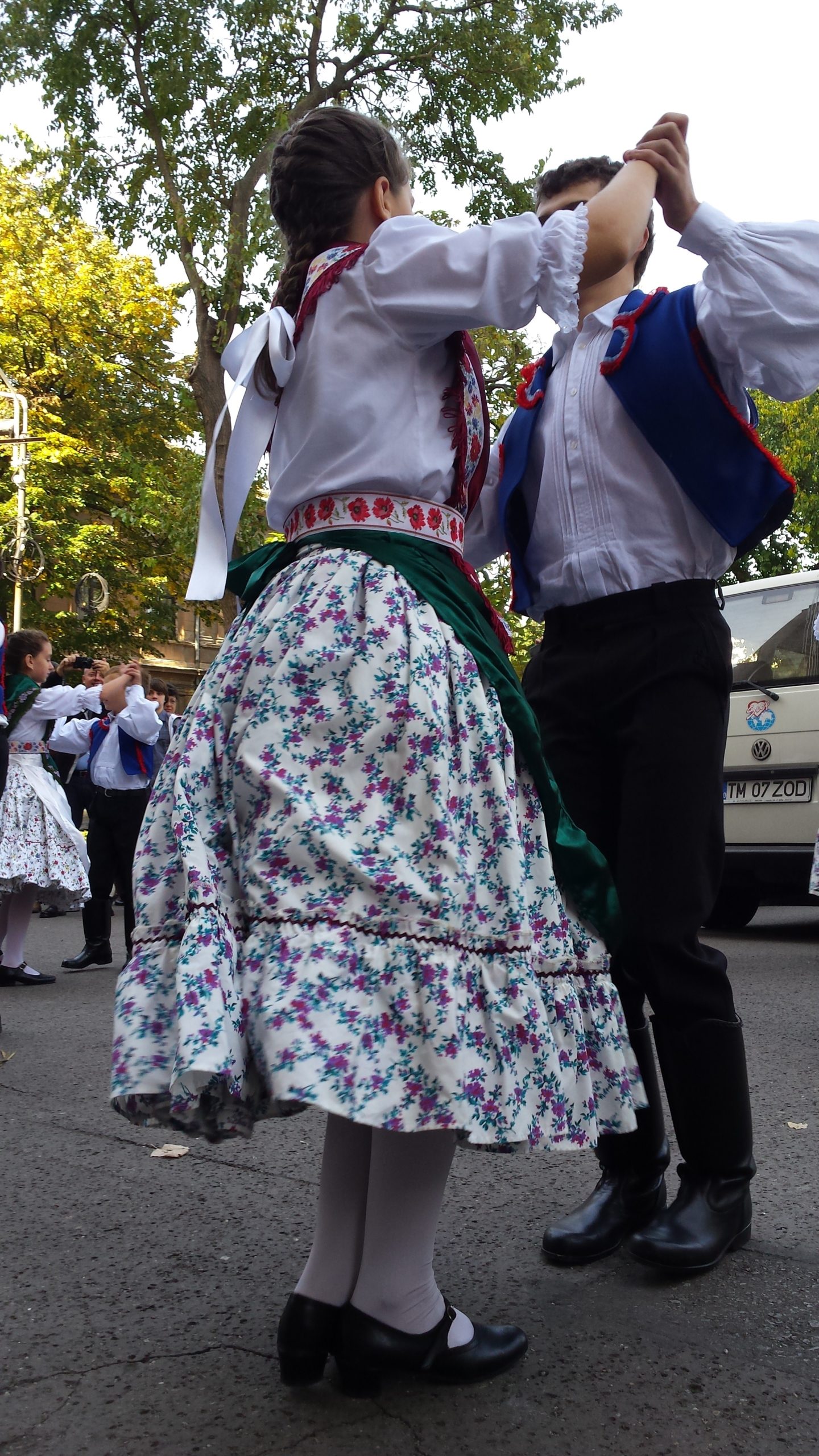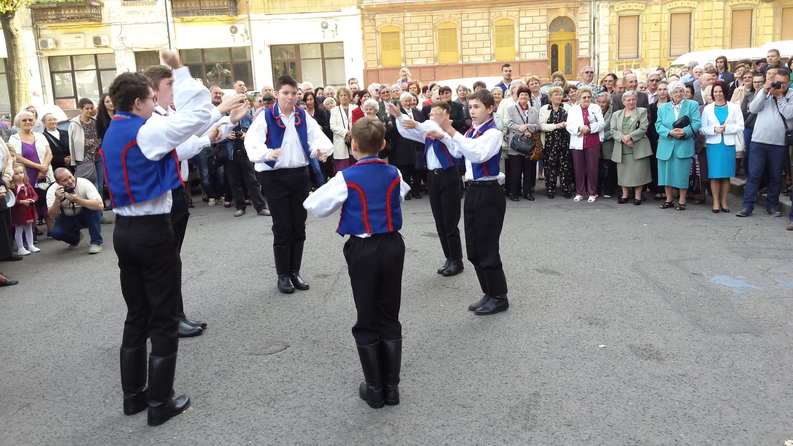 După slujbă, elevii liceului ”Bartok Bela” din Timișoara au prezentat un scurt program de dansuri populare în fața bisericii.