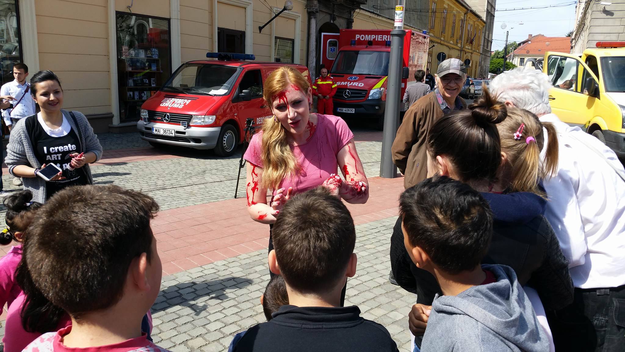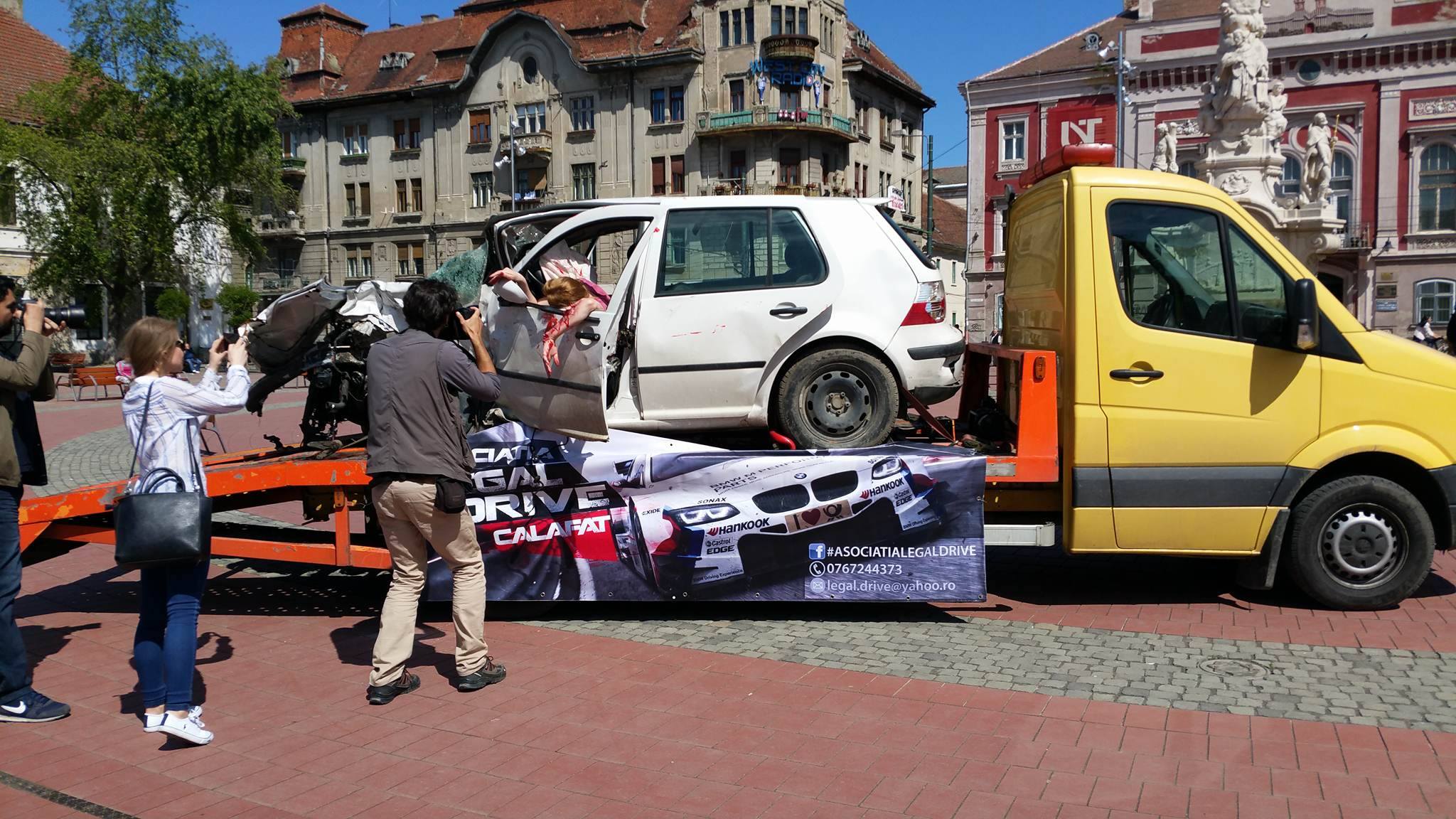 O mașină avariată a fost adusă în Piața Libertății din Timișoara. La volanul mașinii s-a aflat jurnalista Diana Mihai, machiată astfel încât să pară rănită în urma accidentului în care ar fi fost implicată, iar oamenii să vadă cum ar putea arăta o astfel de tragedie în realitate. Scenariul a atras atenția timișorenilor care s-au aflat în Piața Libertății.