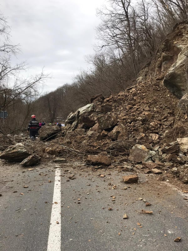 FOTO/ O alunecare de teren a blocat drumul dintre Reșița și Bocșa