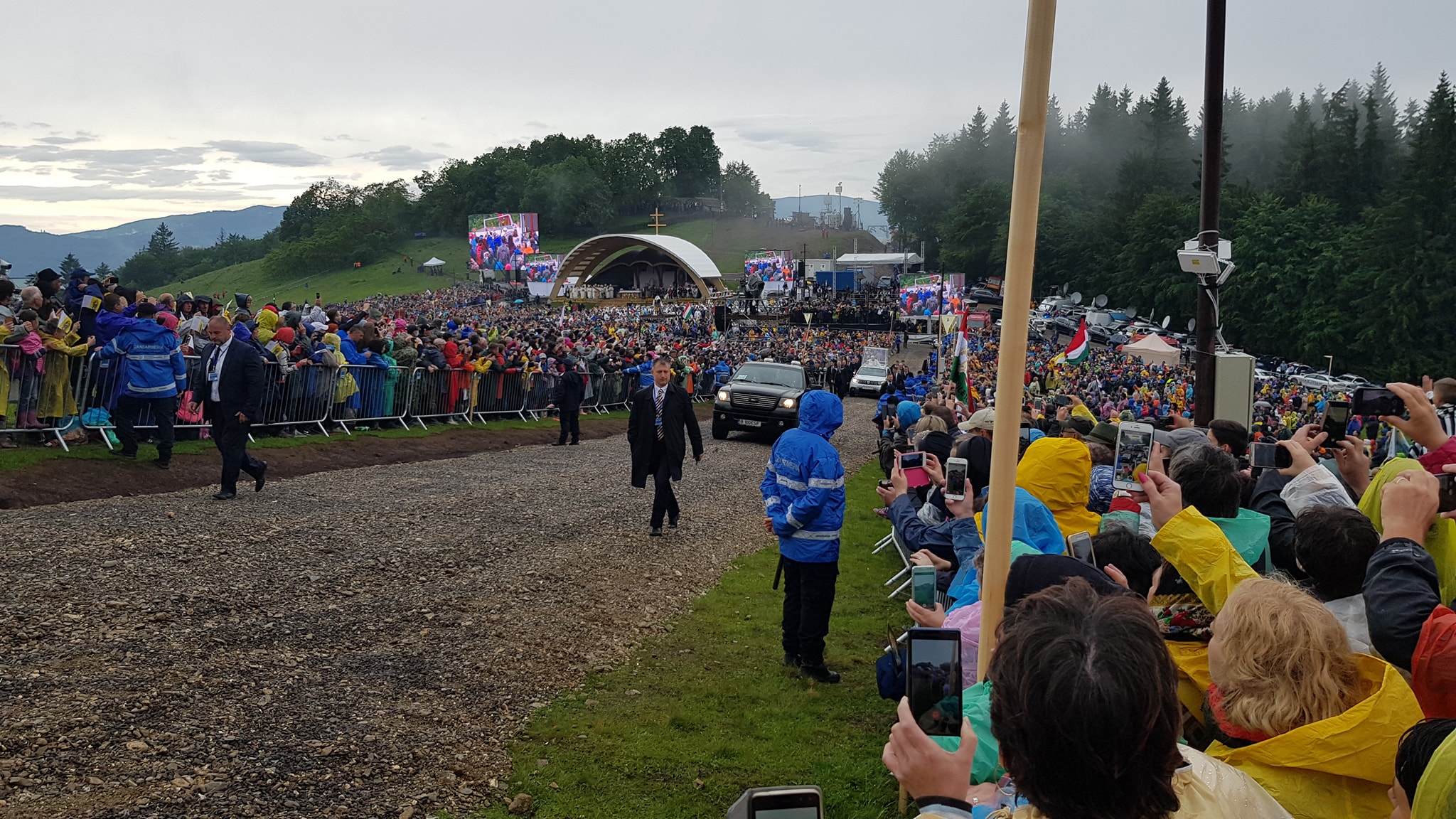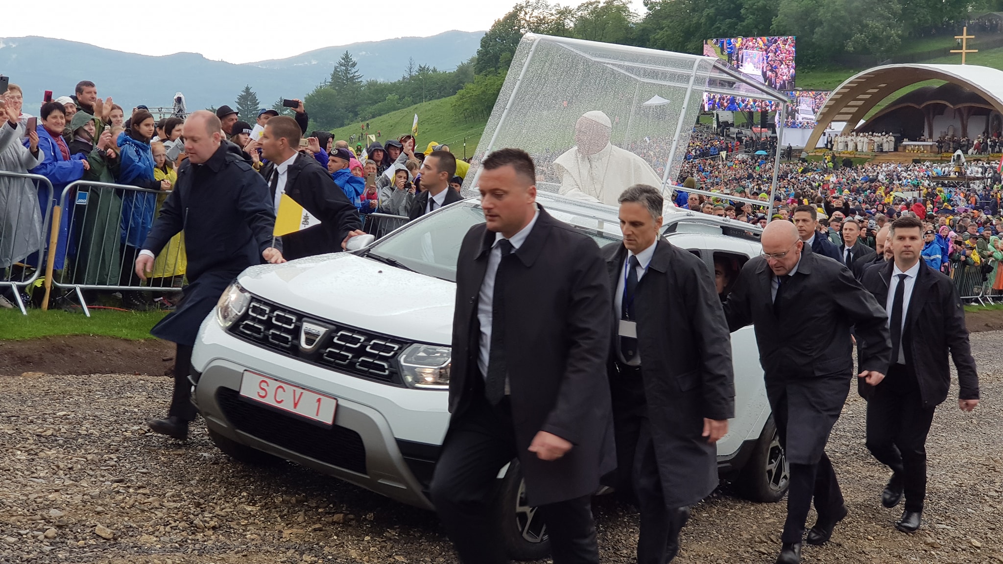 Sanctitatea Sa a venit la Şumuleu Ciuc cu un papamobil de culoare albă, marca Dacia Duster. Papa Francisc a trecut printre sectoarele în care se află pelerinii, iar oamenii l-au salutat cu entuziasm.