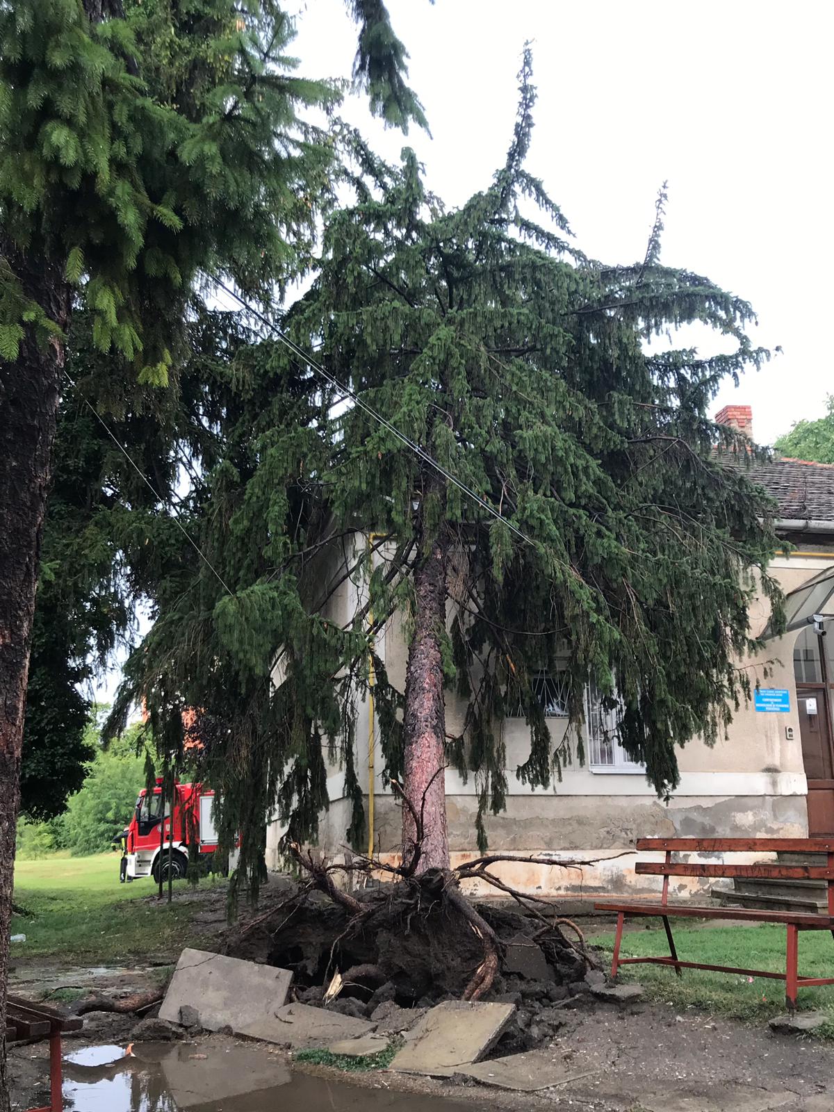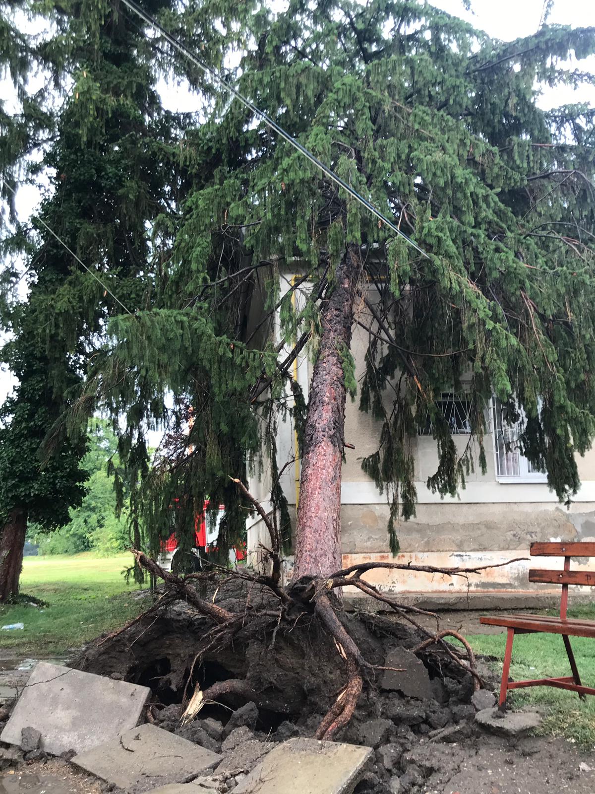 Un brad înalt de peste 15 metri a fost smuls din rădăcini și a căzut pe acoperișul secției Pediatrie 2 din cadrul Spitalului Clinic Județean de Urgență Arad. Pompierii din cadrul Inspectoratului pentru Situații de Urgență Arad au sosit la fala locului pentru a curăța zona.