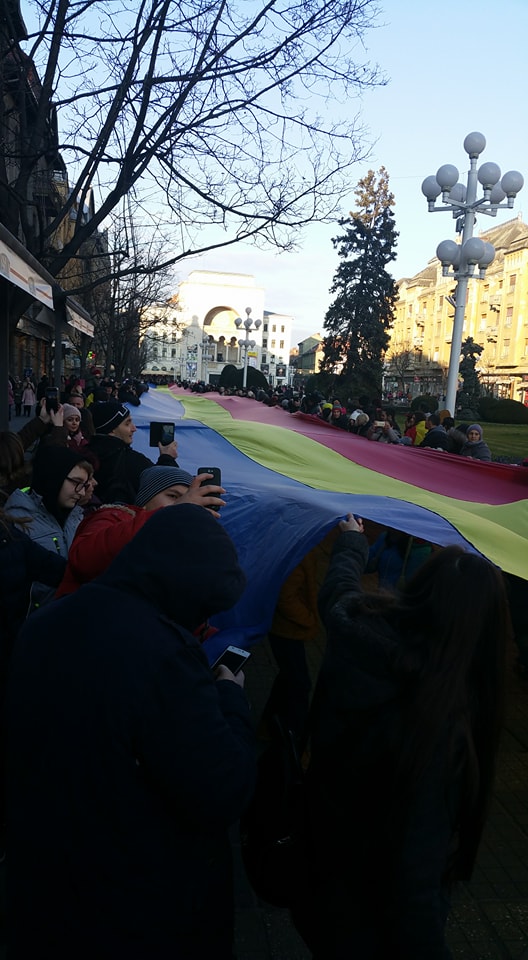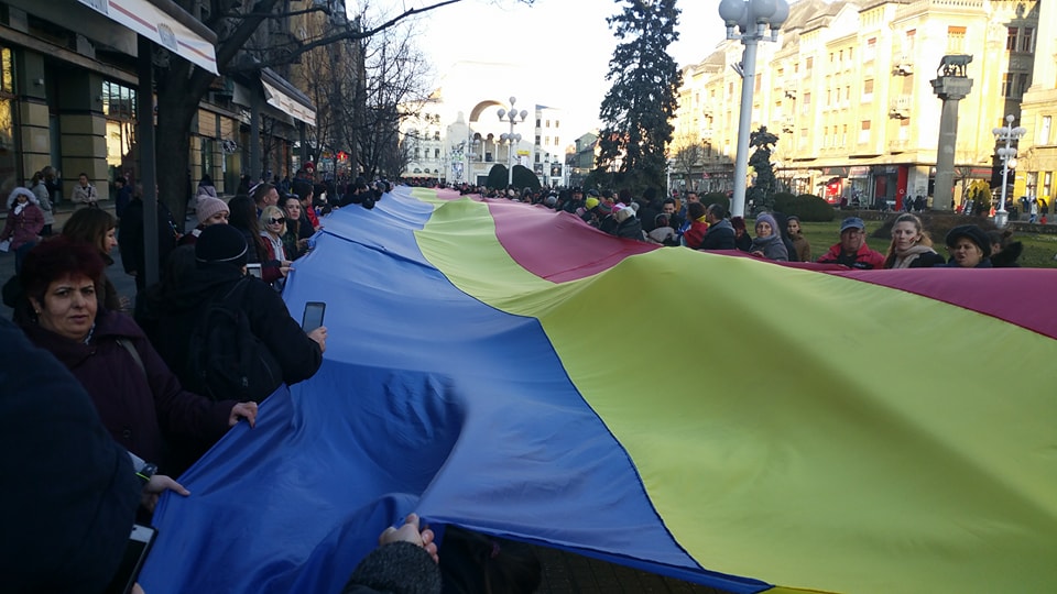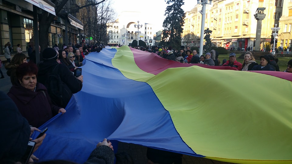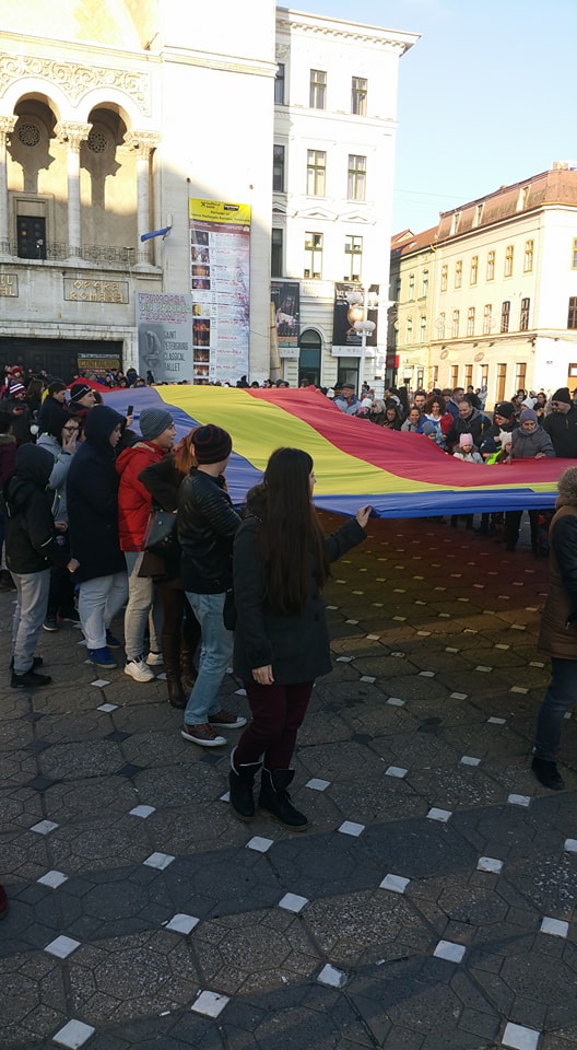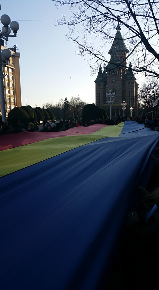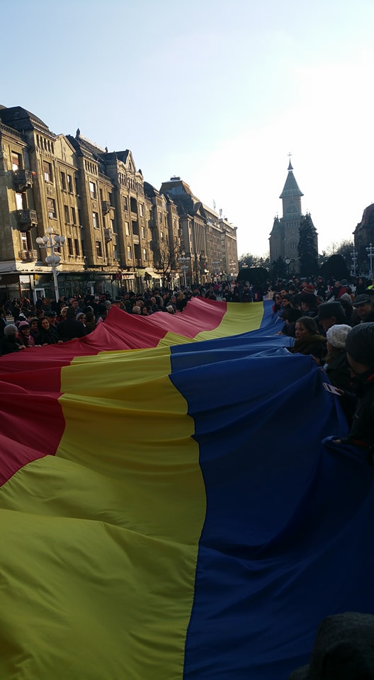 Zeci de persoane au sărbătorit în mod inedit Mica Unire în centrul Timişoarei. Un tricolor de peste 100 de metri a fost întins şi purtat prin Piaţa Operei de timișorenii aflaţi în centrul orașului.
