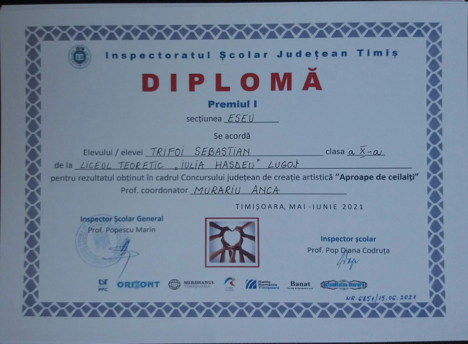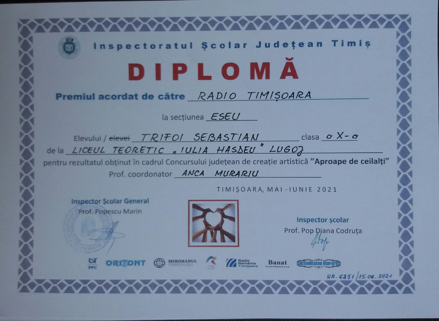 Oferta educaţională extraşcolară a Inspectoratului Şcolar Judeţean Timiş pentru semestrul al II – lea al anului şcolar 2020 – 2021 a inclus, la nivelul disciplinei “Limba şi literatura română – Limbi clasice”, organizarea Concursului Judeţean de Creaţie Artistică – Ediţia I, 2021, pe tema: “Aproape de ceilalţi”. Competiţia s-a adresat elevilor de gimnaziu şi de liceu de la unităţi de învăţământ preuniversitar din judeţul Timiş şi a cuprins cinci secţiuni, pe nivel de clasă: poezie, proză, eseu, interviu filmat şi film de prezentare a unui produs sau eveniment artistic.