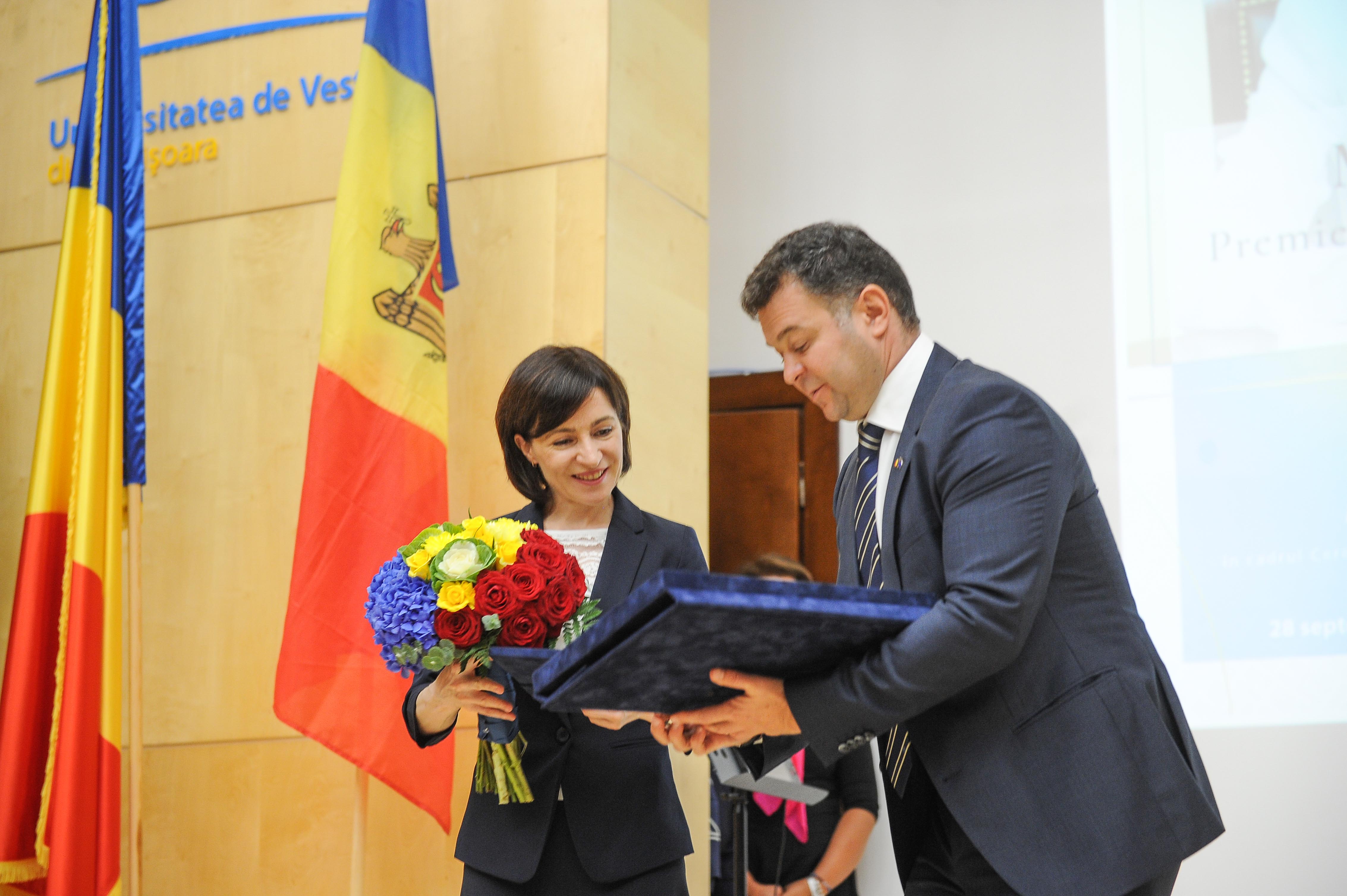 Maia Sandu a fost distinsă cu Medalia de Aur a UVT. Rectorul Marilen Pirtea a subliniat că universitatea recunoaşte meritele premierului moldovean de promotor al educaţiei, al valorilor europene şi transatlantice.