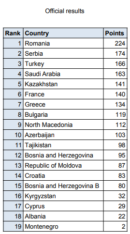 În clasamentul neoficial pe națiuni, România a ocupat locul întâi cu 224 de puncte din 240 posibile, cel mai mare scor general pe echipe înregistrat în istoria competiției. Urmãtoarele locuri de pe podium au fost ocupate de Serbia – 174 de puncte, respectiv Turcia – 166 de puncte.