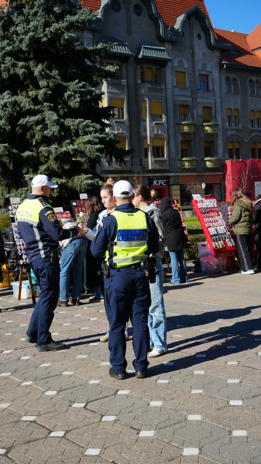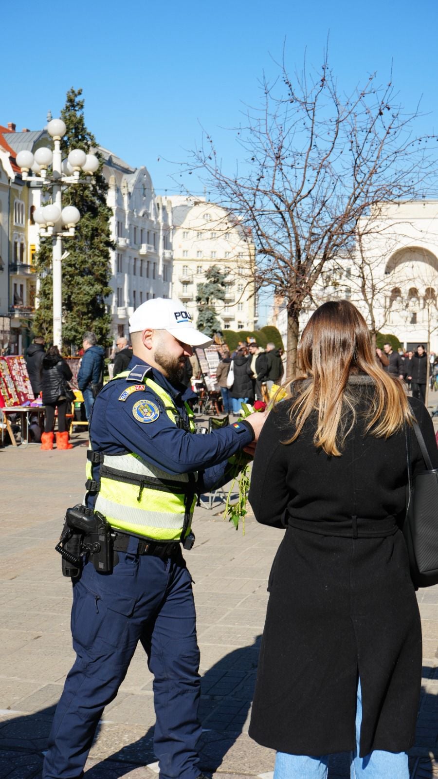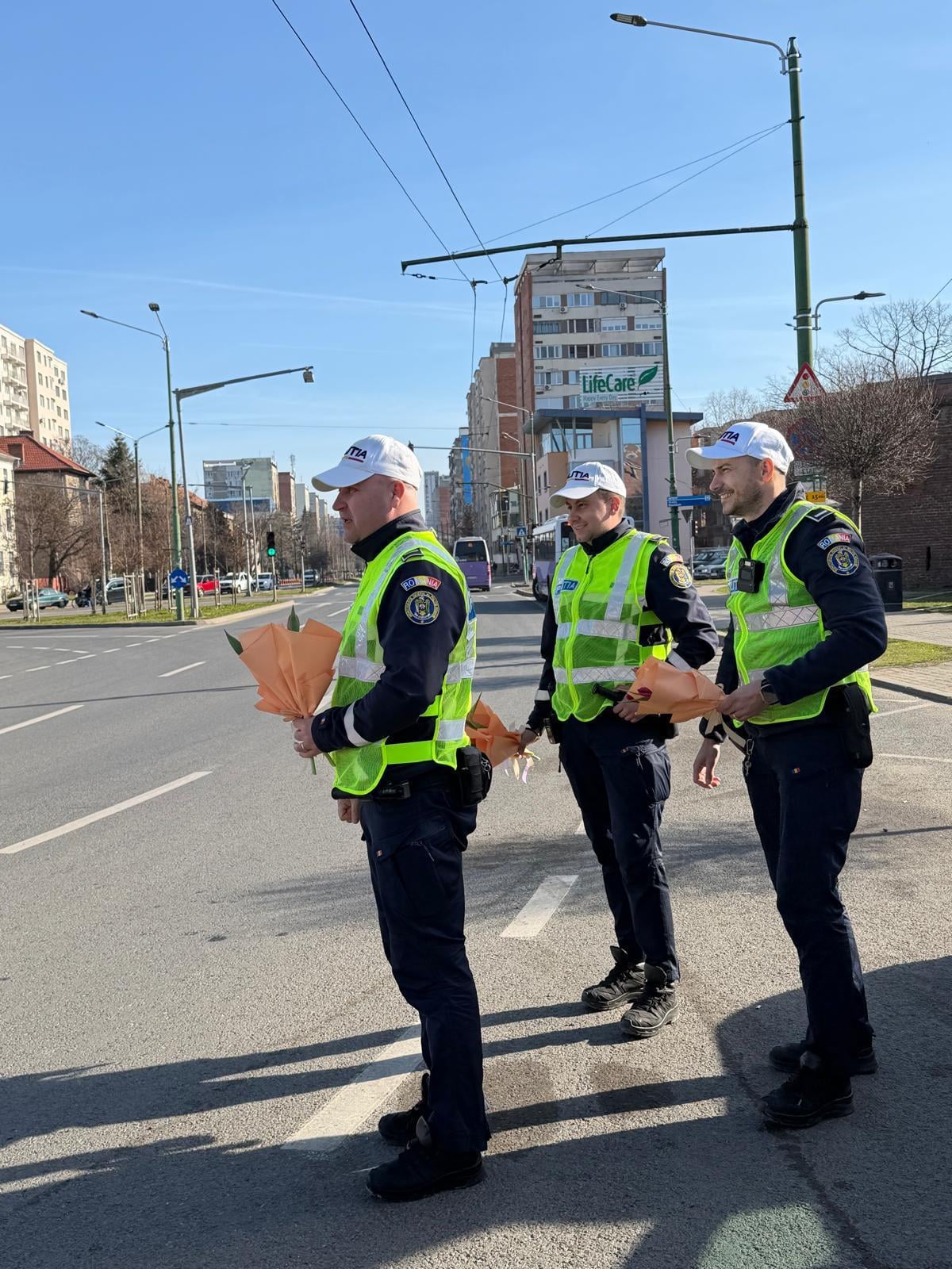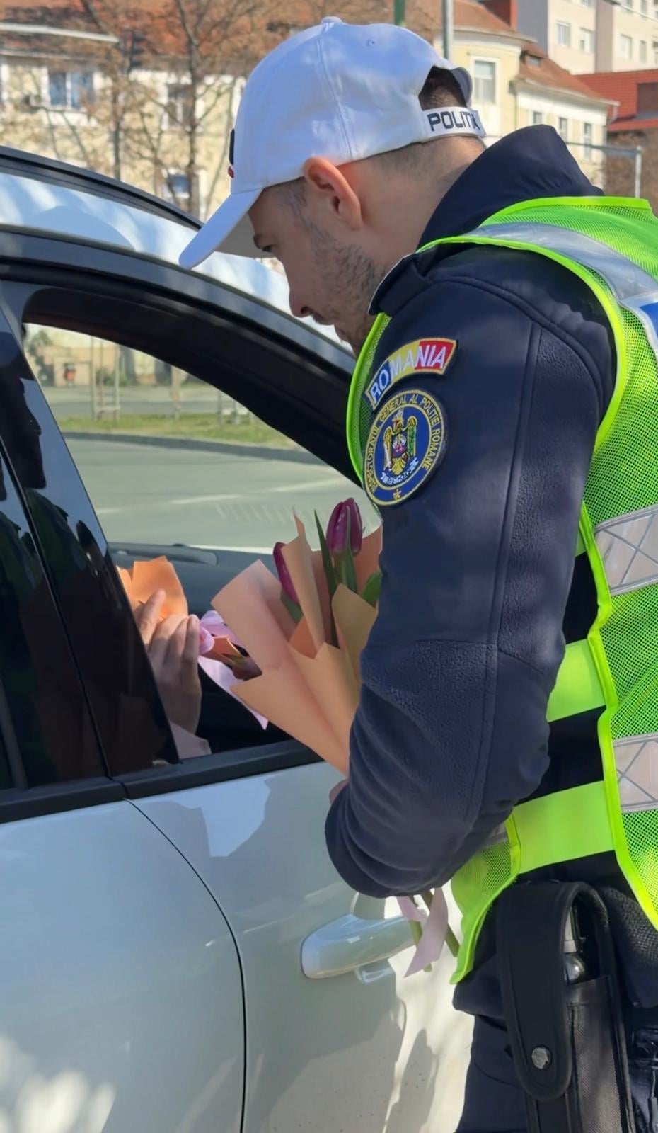 O misiune specială au avut astăzi polițiștii timișeni, dedicată începutului primăverii. În prima zi a acestui anotimp, doamnele și domnișoarele aflate în trafic, dar și cele care se plimbau prin centrul municipiului Timișoara, au fost surprinse plăcut de oamenii legii.