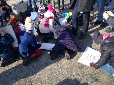 Protestul este extrem de colorat. Copiii au venit cu baloane, cu jucării, cu steaguri, cu pancarte sau cu tricouri pe care scrie „Abrogarea ordonanţei”. Unii sunt costumaţi în supereroi, iar alţii au preferat să deseneze pe asfalt.