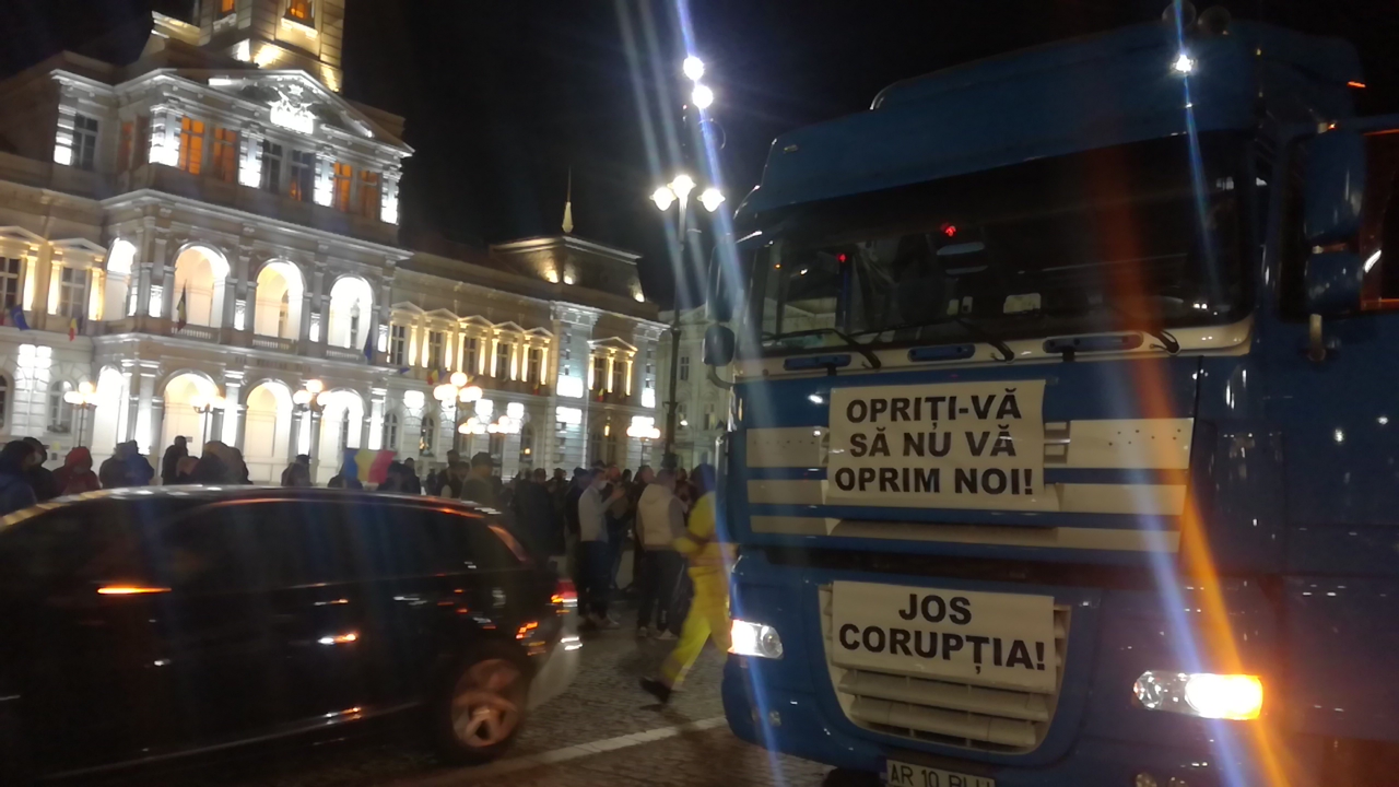 Unii dintre oameni au venit la protest cu 2 cabine de TIR pe care le-au parcat chiar în centrul orașului, în fața primăriei, alături de alte mașini oprite chiar pe carosabil.