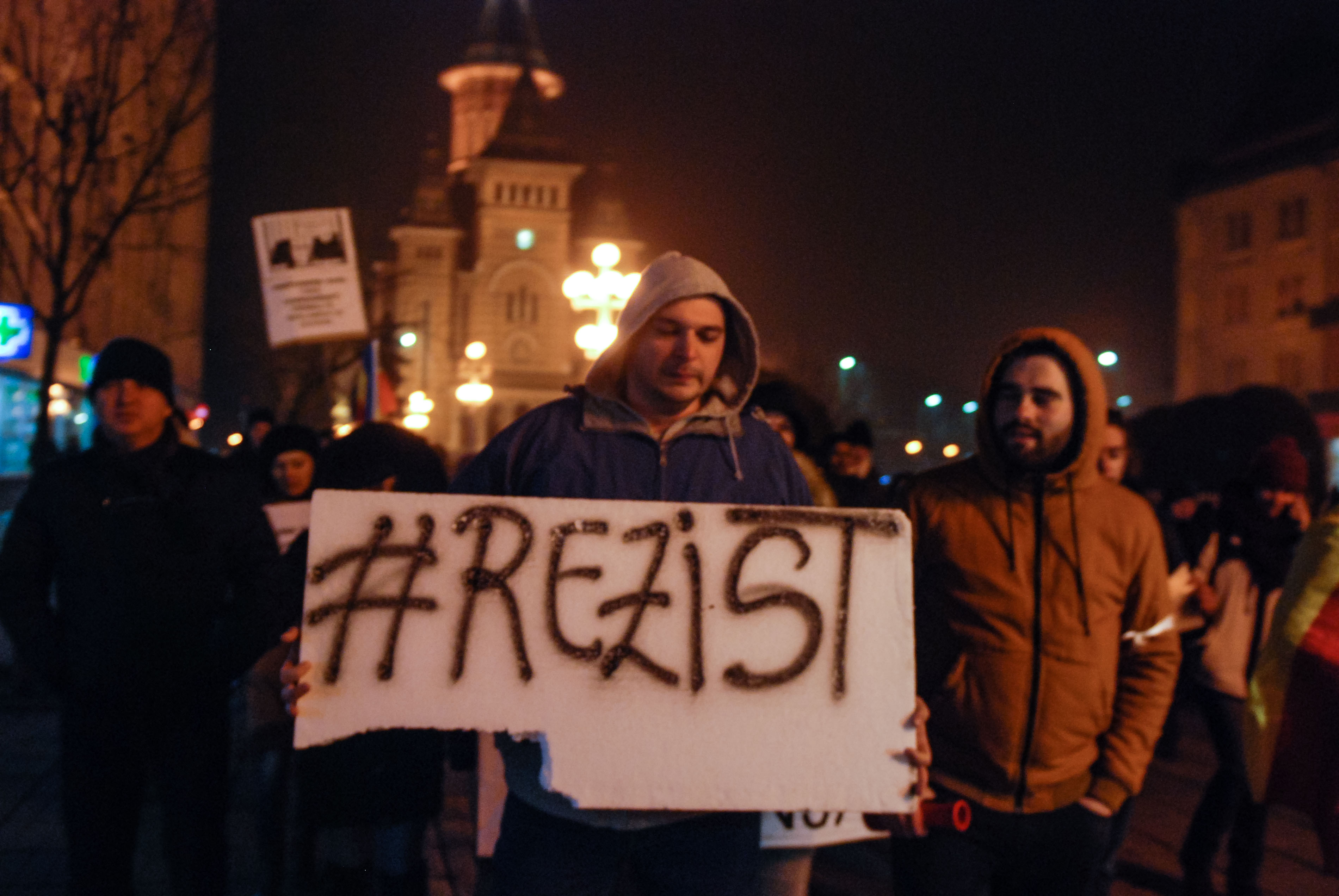 Unii dintre manifestanți au dat zăpada la o parte din zona unde se desfășoară protestul. Pe zăpada care a continuat să cadă manifestanții au scris mesaje precum „Rezistăm!”, „Refuz. Rezist”.