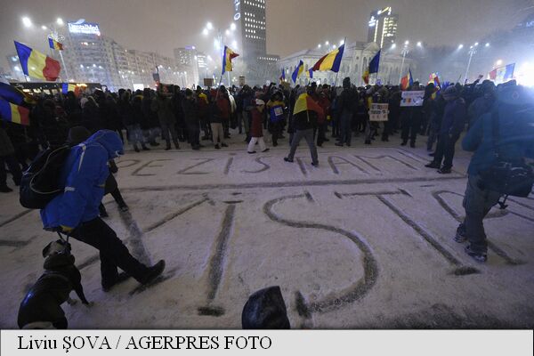 La Bucureşti, câteva sute de persoane s-au adunat şi miercuri seara în Piata Victoriei, pe viscol, într-o nouă zi de proteste anti guvernamentale. La Bucureşti  oamenii au ridicat un om de zapada pe care l-au decorat cu steguleţe.