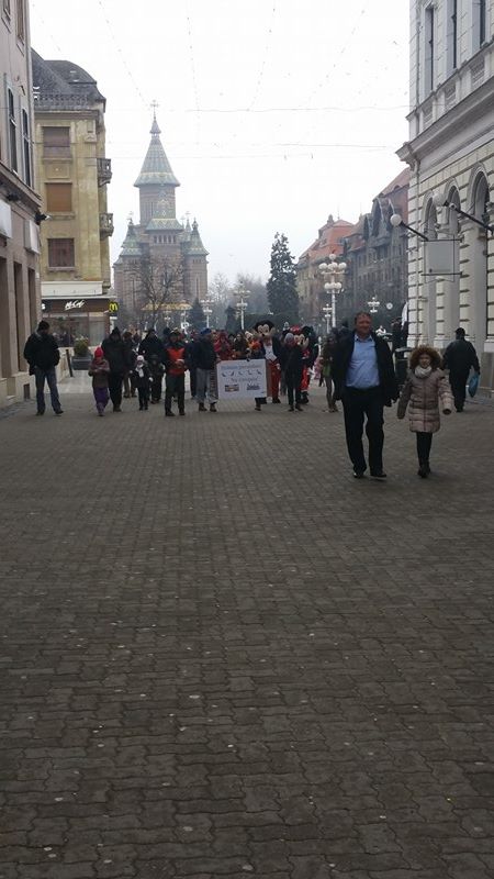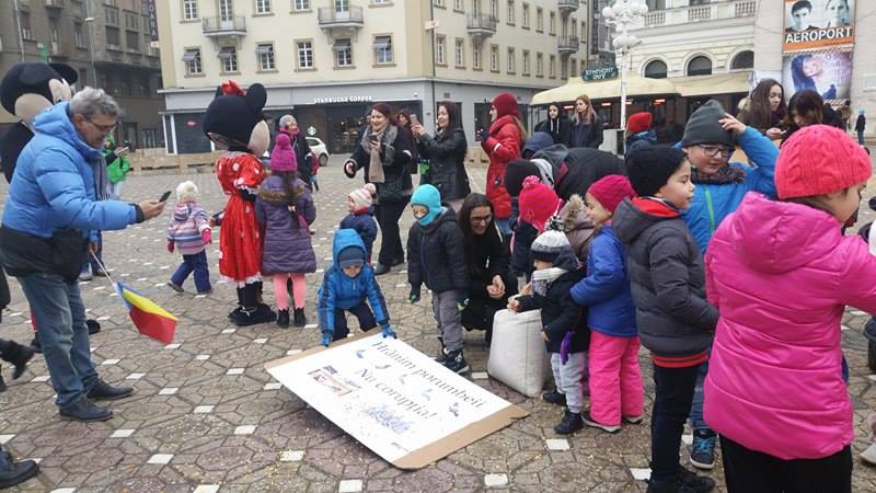 Evenimentul nu a durat foarte mult, mai ales că afară a fost frig. După ce au hrănit porumbeii din Operei, micuţii au încheiat protestul în Piaţa Libertăţii, acompaniaţi de părinți, de Mickey şi Minnie Mouse dar şi de organizatorii protestelor din Timişoara.