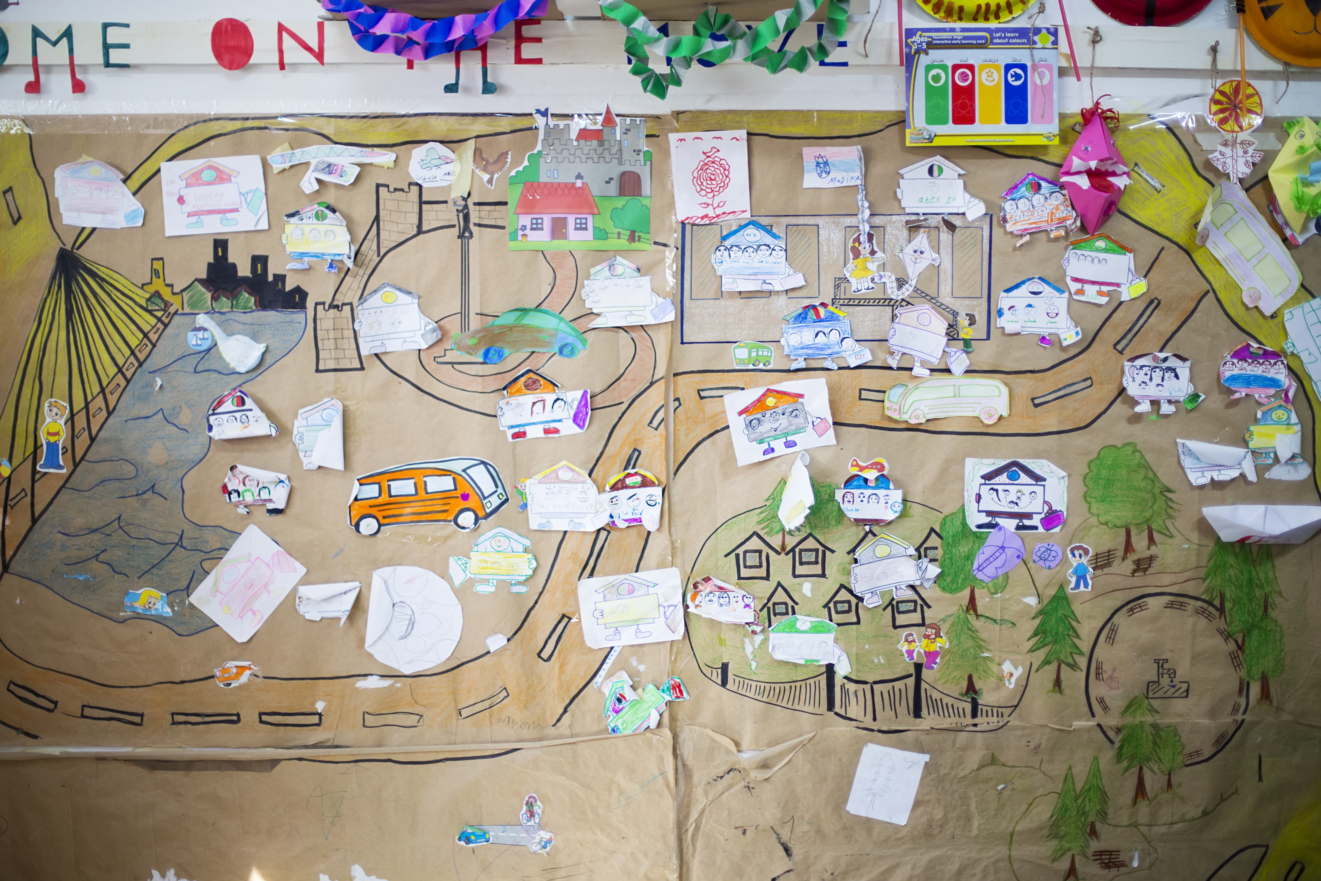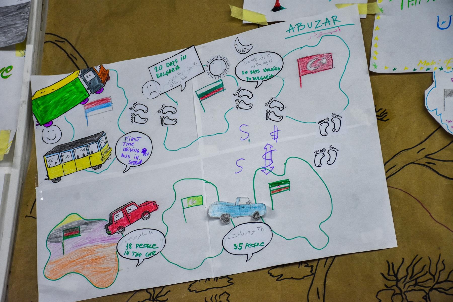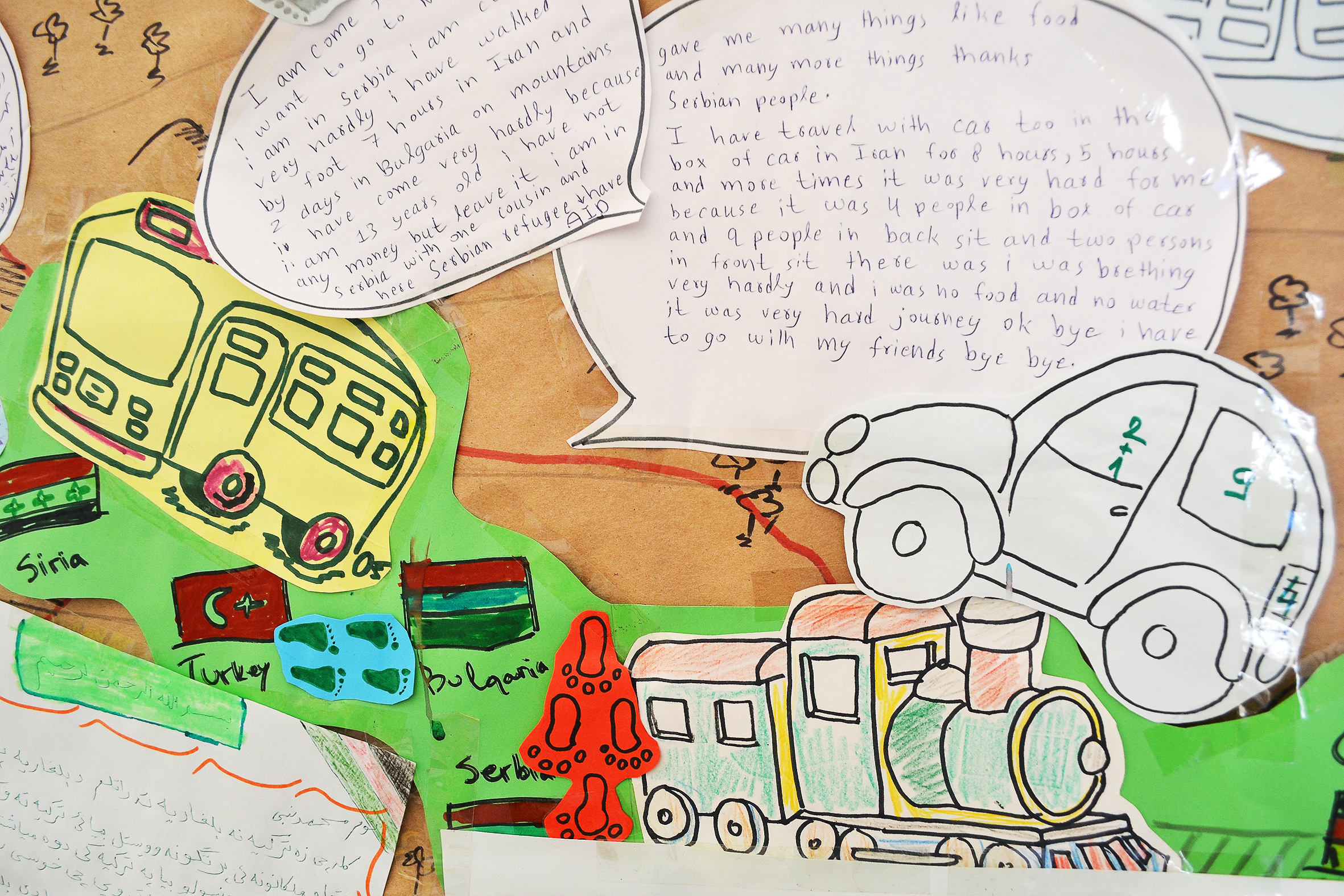 Ajunși la Child Friendly Space copiii devin interesati de harta călătoriei. “La Child Friendly Space, copiii primesc dispozitive cu diverse țări, cu oameni îmbrăcați într-un anumit fel, cu diverse mijloace de transport și altele care ne dau nouă indicii clare despre țara prin care au trecut. Așadar, cu ajutorul tuturor dispozitivelor, se realizează cea mai simplă hartă a călătoriei. Această activitate este foarte foarte utilă pentru că le dă ocazia copiilor să împărtășească povestea lor, să ridice vocea dacă trebuie, ceea ce este foarte important pentru că nu se mai simt invizibili. Important este și că după ce termină harta, ei o pun lângă hărțile făcute de alți copii așa că nu se mai simt singuri. Așa se creează comunitatea copiilor care sunt pe drum. Activitățile acestea sunt foarte importante pentru noi pentru că ne dau foarte multe informații despre drum, dar și despre nevoile copiilor. Putem afla foarte ușor și care le sunt frustrările, ce îi neliniștește. Am făcut hărți 2 D și 3 D. Cele 3 D i-a atras foarte mult, pentru că văd toate elementele așa cum au fost ele și pe traseu. Am făcut și SuperHeroesOnTheWay Map. E o hartă imensă deja făcută și fiecare copil își alege un erou și îl montează în zona de pe traseul parcurs unde el a fost erou. În plus, ne indică și ce super-puteri au avut pentru a depăși problemele”, explică Tatjana Ristic, purtătorul de cuvânt al organizației.