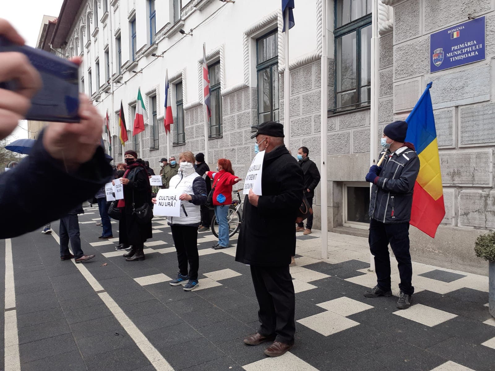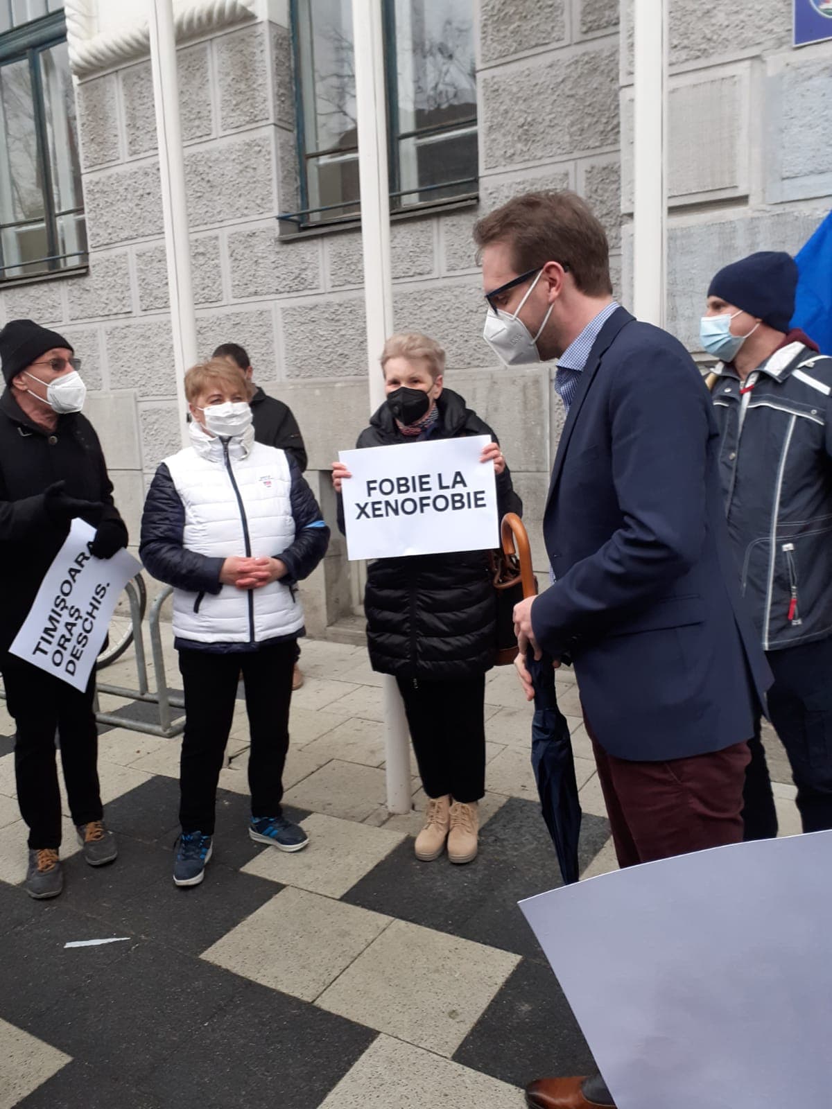 Zeci de timișoreni, scriitori, medici, profesori reprezentanți ai societății civile s-au strâns în această după-amiază în fața Primăriei Timișoara, în semn de protest față de manifestările care au avut loc în fața casei primarului, la finalul lunii martie, în care s-au strigat lozinci xenofobe.
