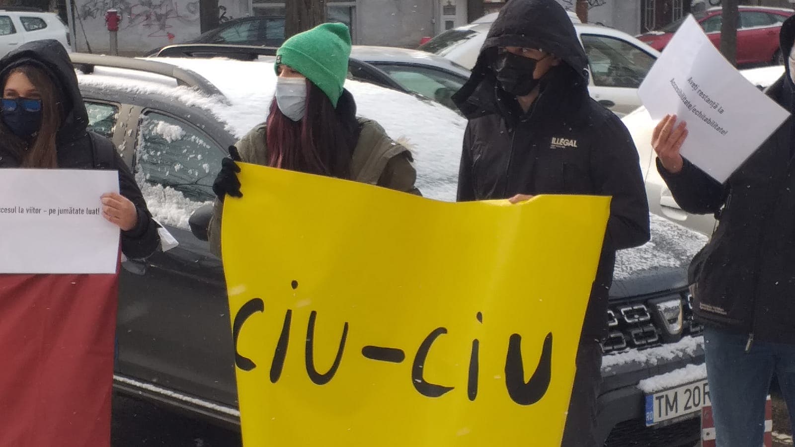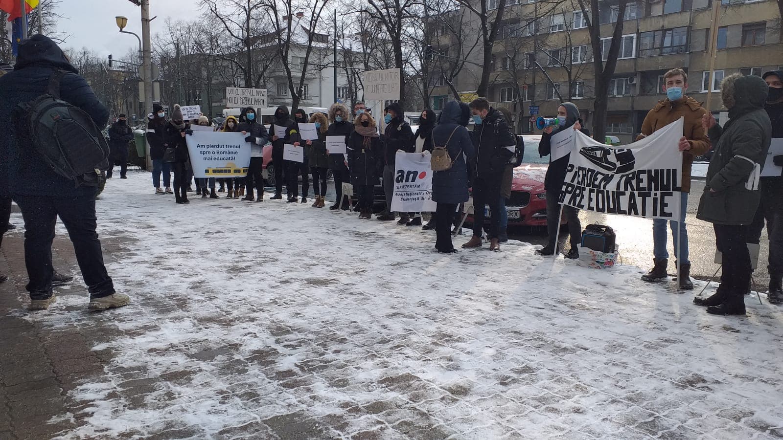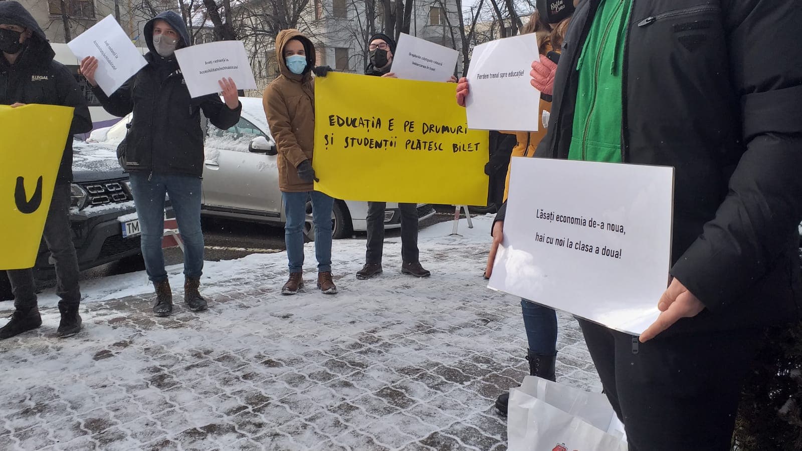 Zeci de studenţi au protestat în faţa Prefecturii Timiş, nemulțumiți de intenția Guvernului de a elimina gratuităţile la călătoriile cu trenul.