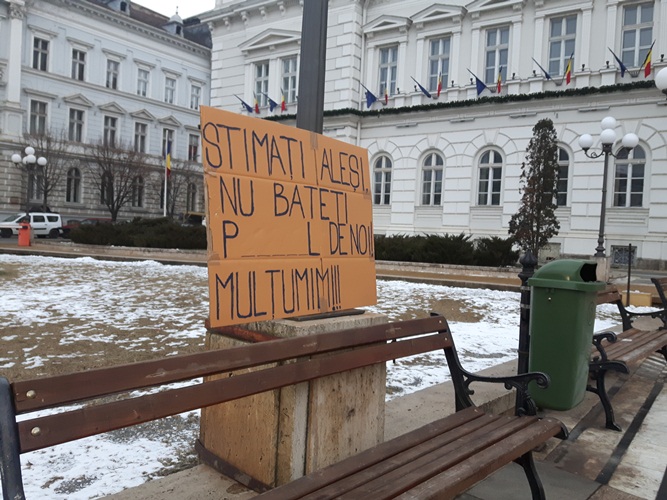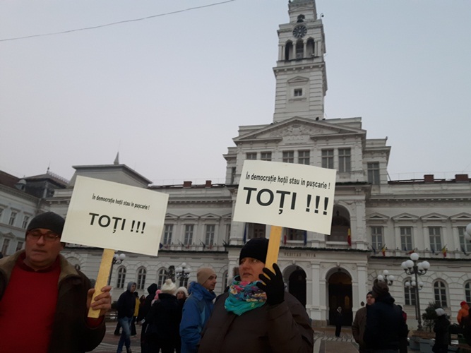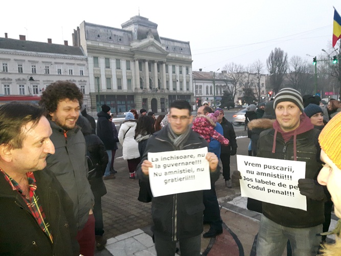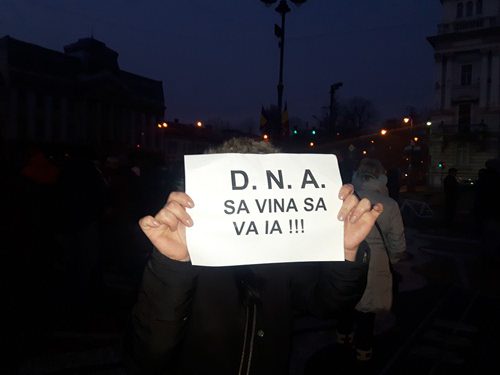 Participanții la protest au afișat pancarte cu mesaje precum: ‘DNA să vină să vă ia’; ‘Fără legi cu dedicație’; ‘Democrație, bun simț, respect’; ‘Vrem pușcării, nu amnistii’; ‘Jos labele de pe Codul Penal’; ‘În democrație hoții stau la pușcărie. Toți!’.