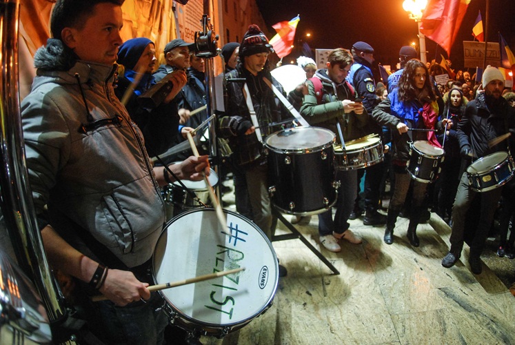 FOTO / Protest în Piața Victoriei din Timișoara, pentru cea de-a cincea zi. Muzicienii au adus tulnice și tobe