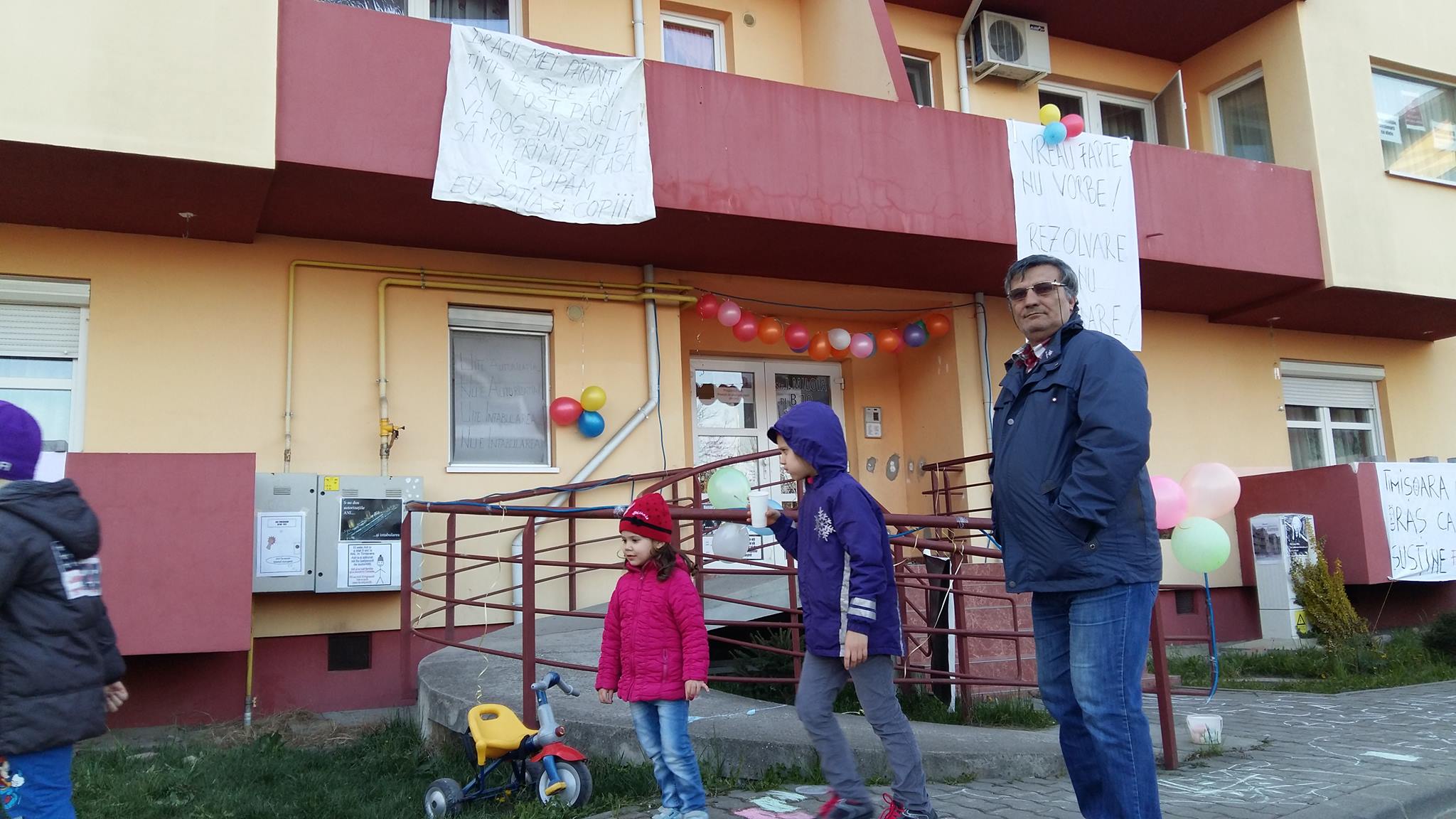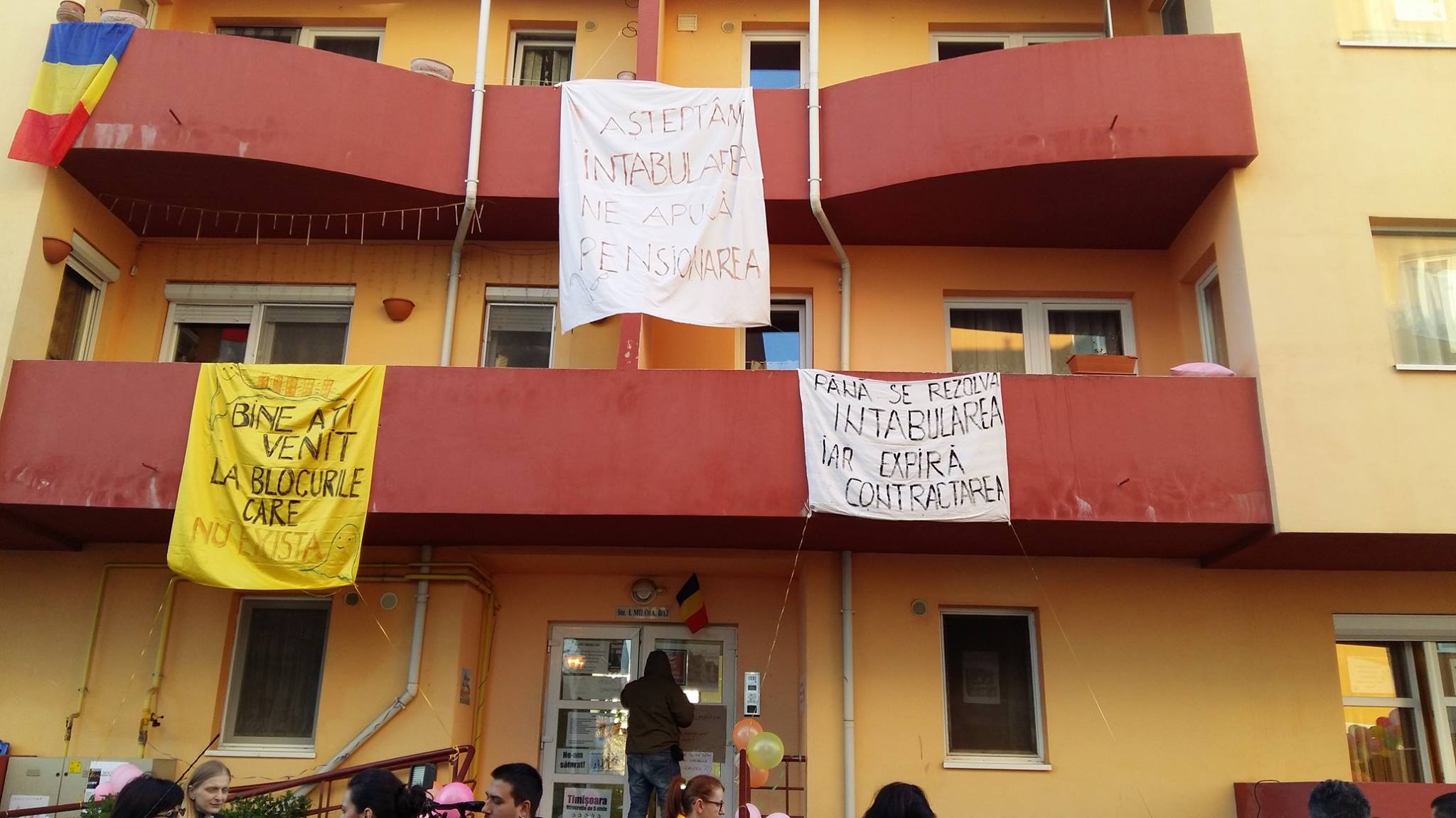 Nemulțumiți de faptul că apartamentele în care locuiesc nu pot fi intabulate, iar asta îi împiedică să-și cumpere apartamentele, oamenii au organizat în fața blocului un protest sub formă de petrecere.