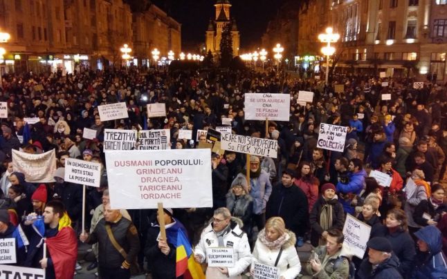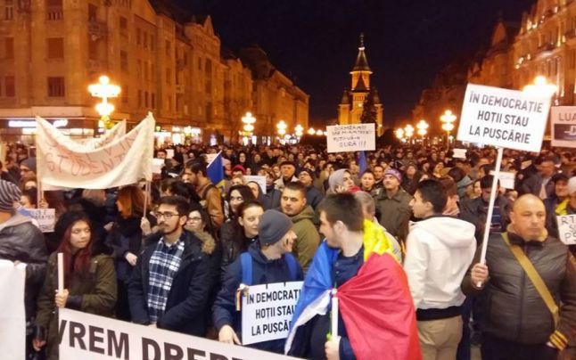 Peste 15.000 de timișoreni s-au strâns în Piața Victoriei. La ora 21, manifestanții au pornit într-un marș spre strada Take Ionescu, prin Badea Cârțan, prin fața Prefecturii și înapoi în Piața Victoriei. Oamenii îi îndeamnă pe cei de la București să lupte și spun „Nu plecăm acasă, hoții nu ne lasă”.