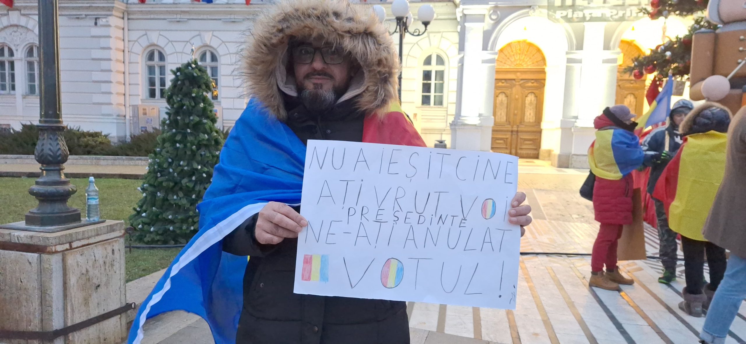 Mai multe persoane au ieşit, duminică, să protesteze în fața primăriei din municipiul Arad.