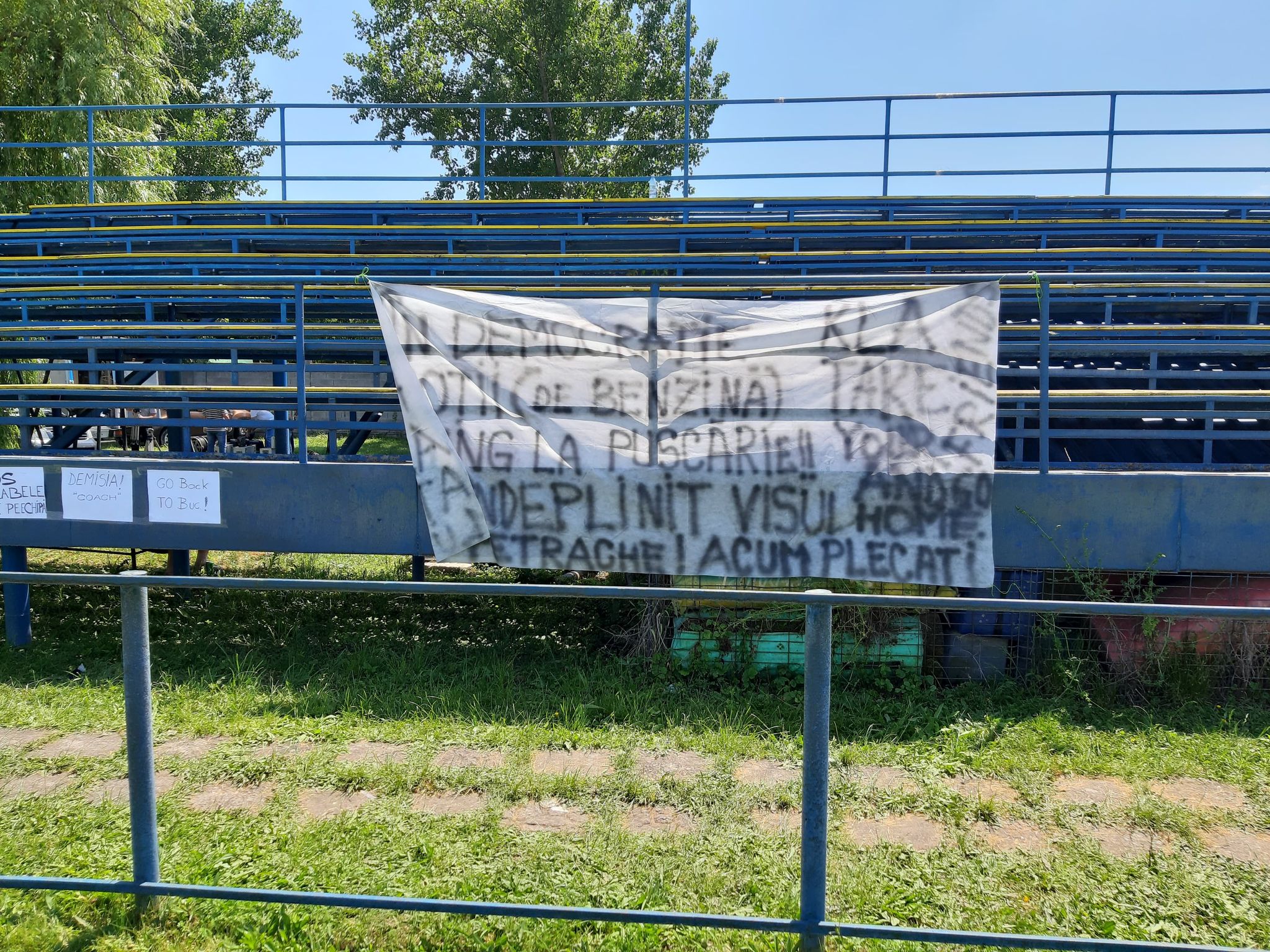 Altfel, victoria a fost umbrită de protestele unui grup de suporteri la adresa conducerii tehnice a echipei. La stadion, au fost afișate câteva bannere prin care i se cerea plecarea antrenorului Valentin Calafeteanu: „Echipa nu e a voastră!”, „Demisia, coach!”, „Jos labele de pe echipă”, „Go back to Buc.!”, „În democrație, hoții (de benzină) plâng la pușcărie!”, „I-ați îndeplinit visul lui Petrache! Acum plecați!” și „KLA, take your friends and go home!”, au fost mesajele cu care au fost întâmpinați azi, la stadion, jucătorii și staff-ul tehnic de la SCM Timișoara.