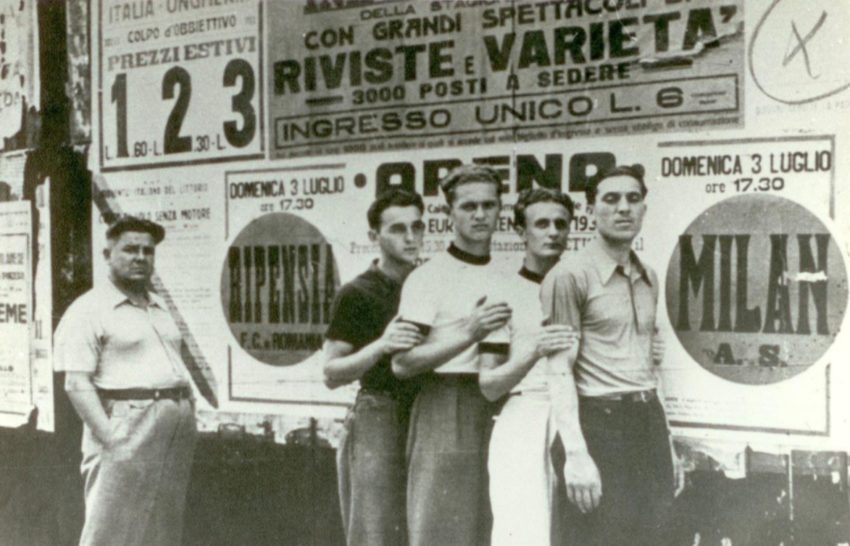 Josef Pojar (în stânga), alături de un grup de jucători ai Ripensiei – Oprean, Marcu, Nagy, Pavlovici – la Milano