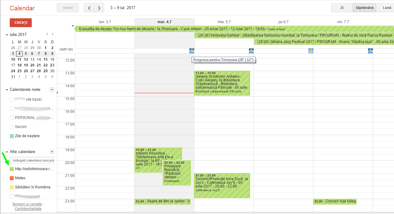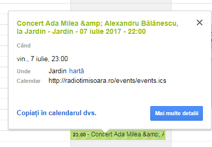 - În calendarul de bază îți apar acum evenimentele viitoare din Agenda Evenimentelor din săptămâna curentă (dacă nu apar, apasă pătratul din dreptul adresei cu http://radiotimisoara.ro/events/events.ics). Culoarea fundalului se poate schimba (verde, în ideea de timp liber, ca în exemplu)Pentru a a adăuga evenimentul dorit în propriul calendar fă click pe acesta.