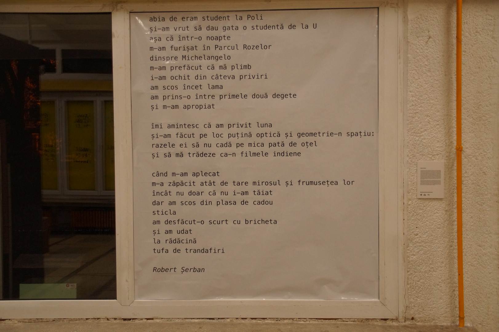 A fost o seara de poezie și amintiri din studenție cu scriitorul și absolventul Politehnicii – Robert Șerban. Întâlnirea a fost în holul Facultatii de Mecanica, acolo unde se poate citi, pâna la sfârșitul anului , un poem despre un moment al studentiei, în cadrul expozitiei Campus 100 (unu unu zero zero unu zero zero în cod binar).