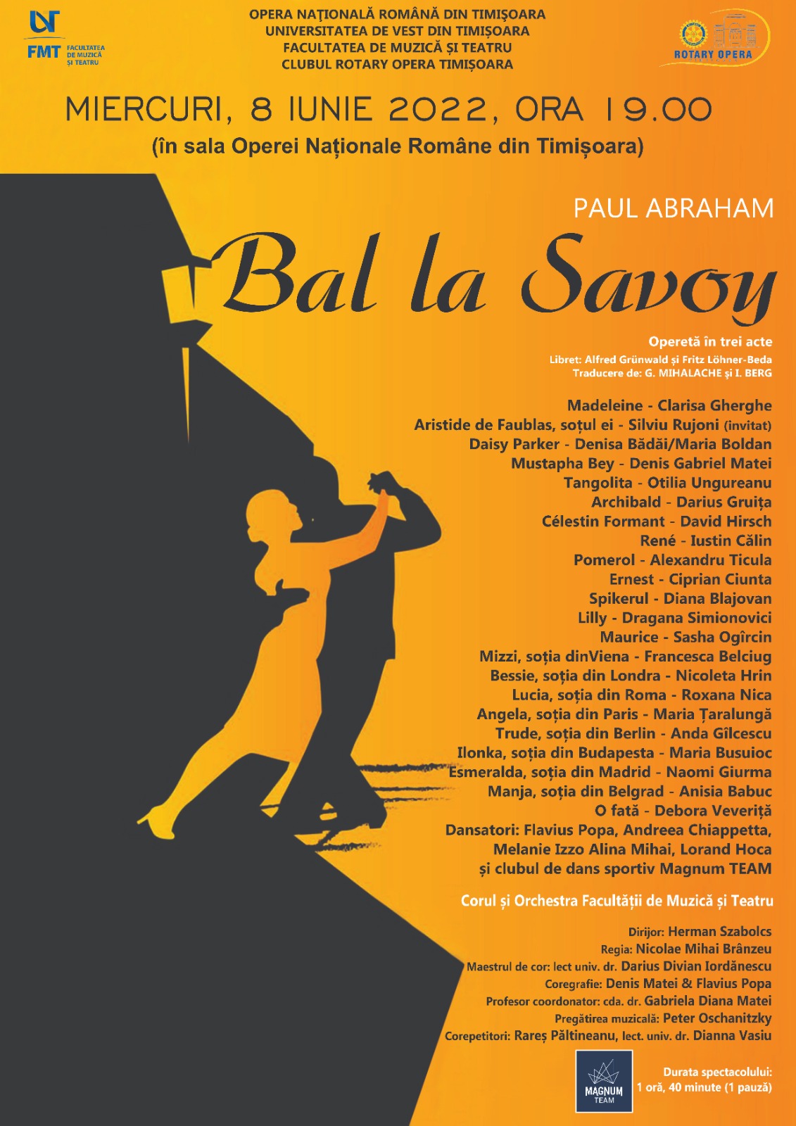 Universitatea de Vest – Facultatea de Muzică şi Teatru, cu sprijinul Operei Naţionale Române din Timişoara şi al Clubului Rotary Opera Timişoara, prezintă “Bal la Savoy” de Paul Abraham, spectacol de operetă, la Opera Naţională Română din Timişoara.