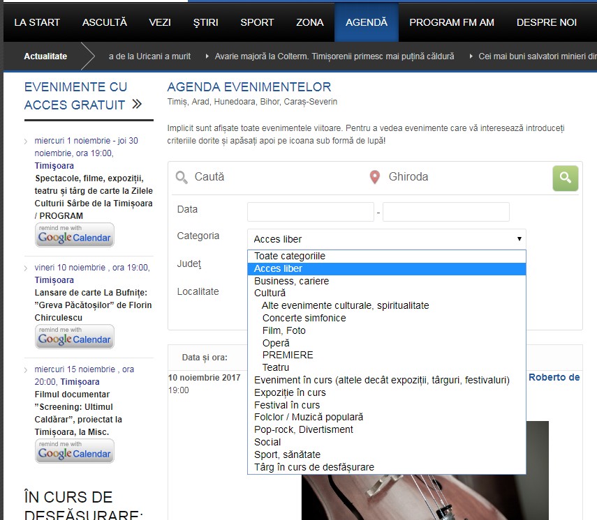 De exemplu (foto) dacă locuiți în Ghiroda și doriți să căutați evenimentele cu acces gratuit din apropiere, introduceți numele localității, selectați categoria ”Acces liber” și apăsați apoi pe icoana sub formă de lupă!