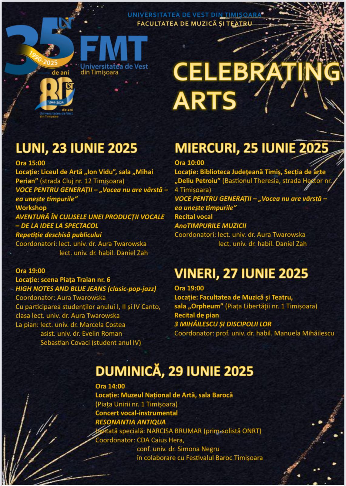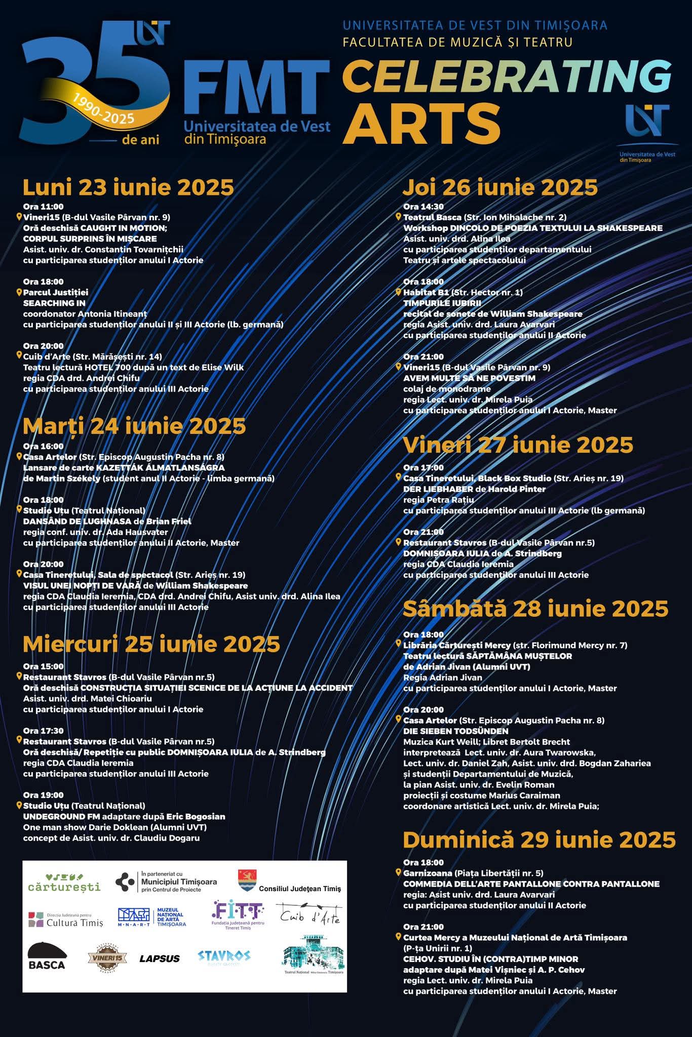 Sub auspiciile jubileului, „Celebrating Arts” – Festival FMT35 va aduce în atenția publicului, în perioada 23 – 29 iunie 2025, profesori și studenți de la ambele departamente ale Facultății de Muzică și Teatru – UVT: Muzică, respectiv, Teatru și Artele spectacolului.